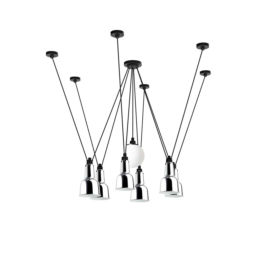 Pendant lamps in cast aluminium and textile cables. Les Acrobates de Gras perform various figures in the air, perched at a height of several metres. The spectacle is bold: in movement, rhythm and colour. The colours and shapes of the Gras reflectors and glass balls (sizes L, XL, Ø175 and Ø250) offer a dynamic and elegant display. Les Acrobates de Gras can be linked together. Each one can perform its number!
