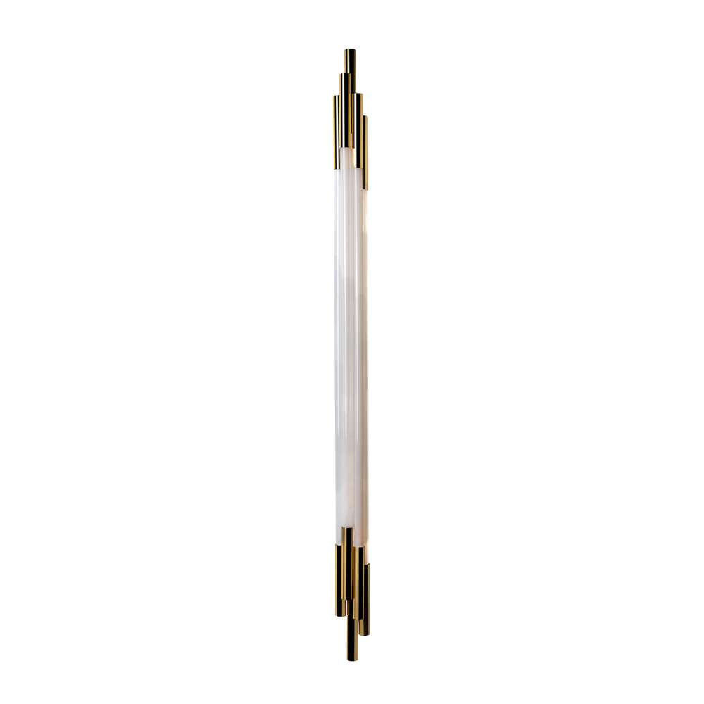 Wall lamp in anodised aluminium (gold finish) and opaline glass. The designer Sebastian Summa was inspired by science fiction and astronomy to create a lamp like a shooting star. Available in 3 sizes, and also as a vertical pendant.