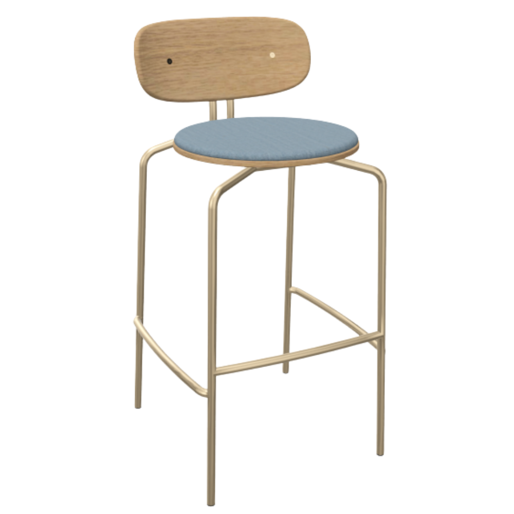 Curious barstolen fra Umage er her opgraderet med en polstret sædehynde i blød, genanvendt polyester – en kombination af æstetik og komfort i smuk balance. Den varme egefiner møder et elegant stel i messing og en dæmpet, behagelig siddeflade, der løfter oplevelsen i både køkken og lounge.