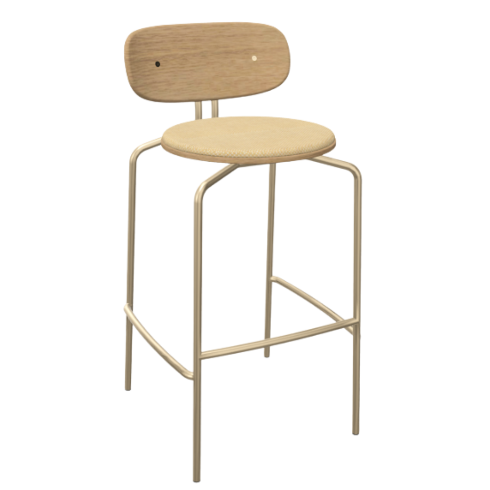 Curious barstolen fra Umage er her opgraderet med en polstret sædehynde i blød, genanvendt polyester – en kombination af æstetik og komfort i smuk balance. Den varme egefiner møder et elegant stel i messing og en dæmpet, behagelig siddeflade, der løfter oplevelsen i både køkken og lounge.