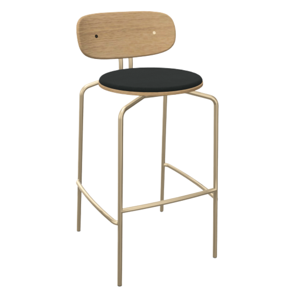 Curious barstolen fra Umage er her opgraderet med en polstret sædehynde i blød, genanvendt polyester – en kombination af æstetik og komfort i smuk balance. Den varme egefiner møder et elegant stel i messing og en dæmpet, behagelig siddeflade, der løfter oplevelsen i både køkken og lounge.