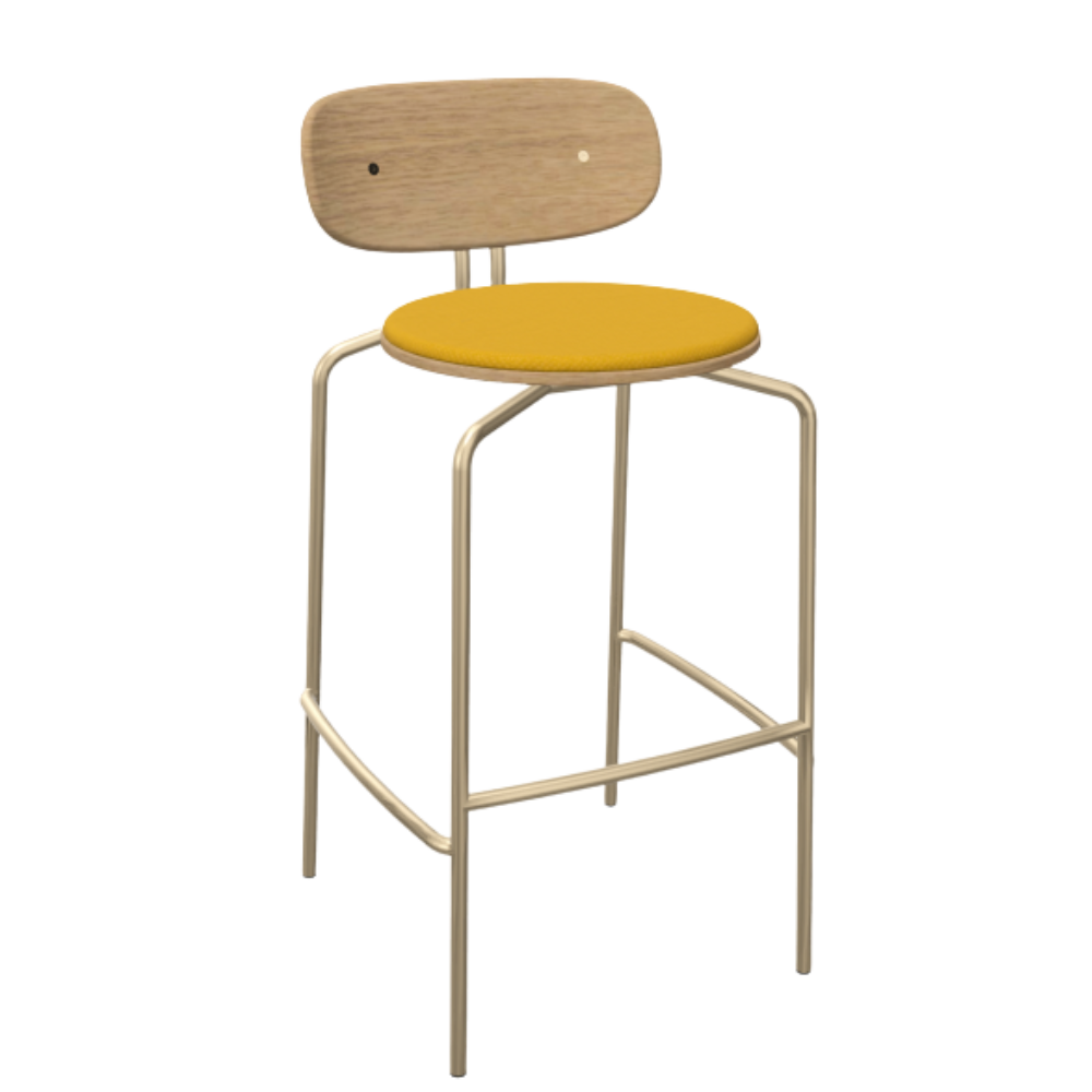 Curious barstolen fra Umage er her opgraderet med en polstret sædehynde i blød, genanvendt polyester – en kombination af æstetik og komfort i smuk balance. Den varme egefiner møder et elegant stel i messing og en dæmpet, behagelig siddeflade, der løfter oplevelsen i både køkken og lounge.