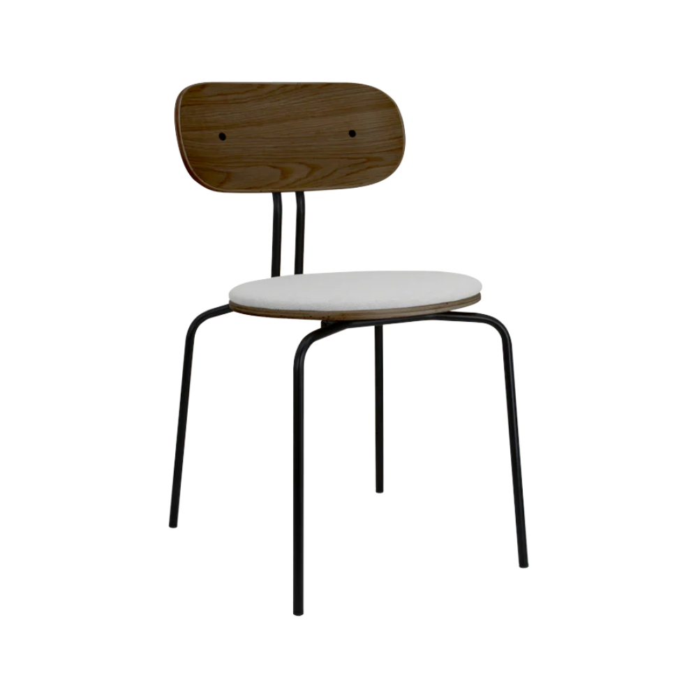 Umage Curious spisebordsstol er et raffineret bud på moderne spisebordsdesign med fokus på bæredygtighed og æstetik. Her mødes det mørke, røgede egetræ med sortlakeret stål og en blød overflade i genanvendt polyester – et bevidst valg for både stil og samvittighed.