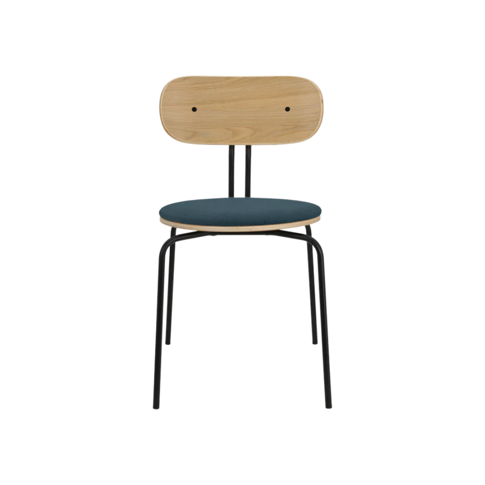 Umage Curious spisebordsstol kombinerer lethed og styrke i ét gennemtænkt design. Med et stel i sort pulverlakeret stål og sæde i egefiner, betrukket med blødt, genanvendt polyester, får du en stol der balancerer bæredygtighed og æstetik.