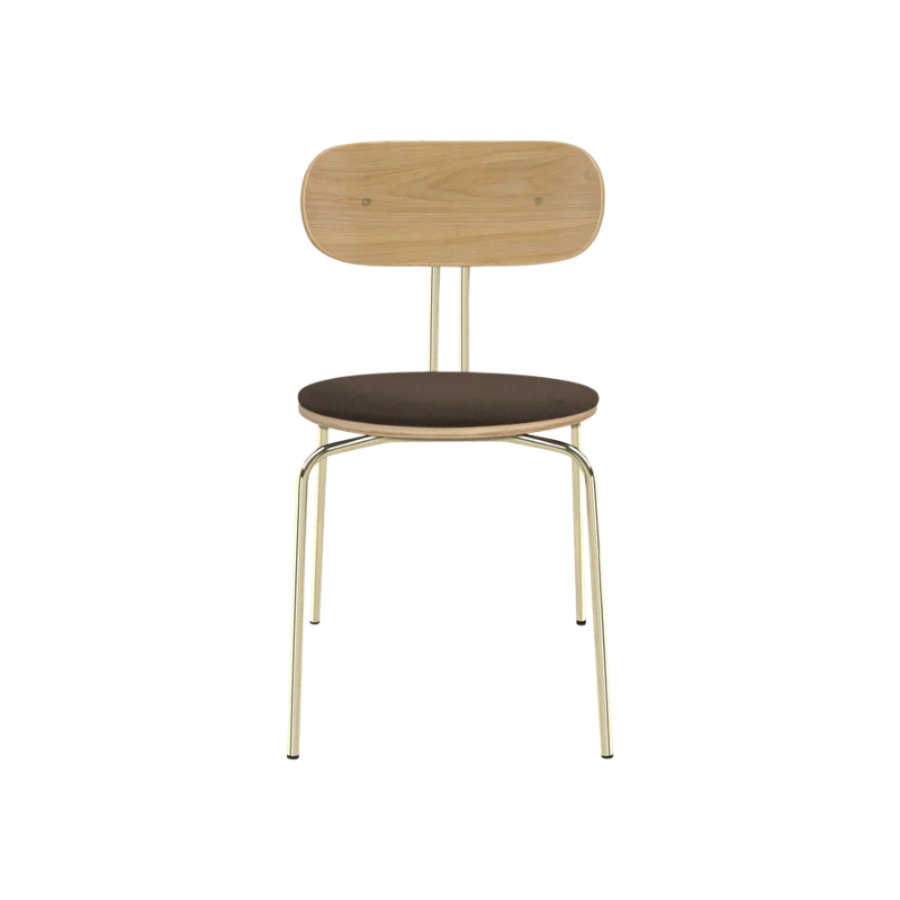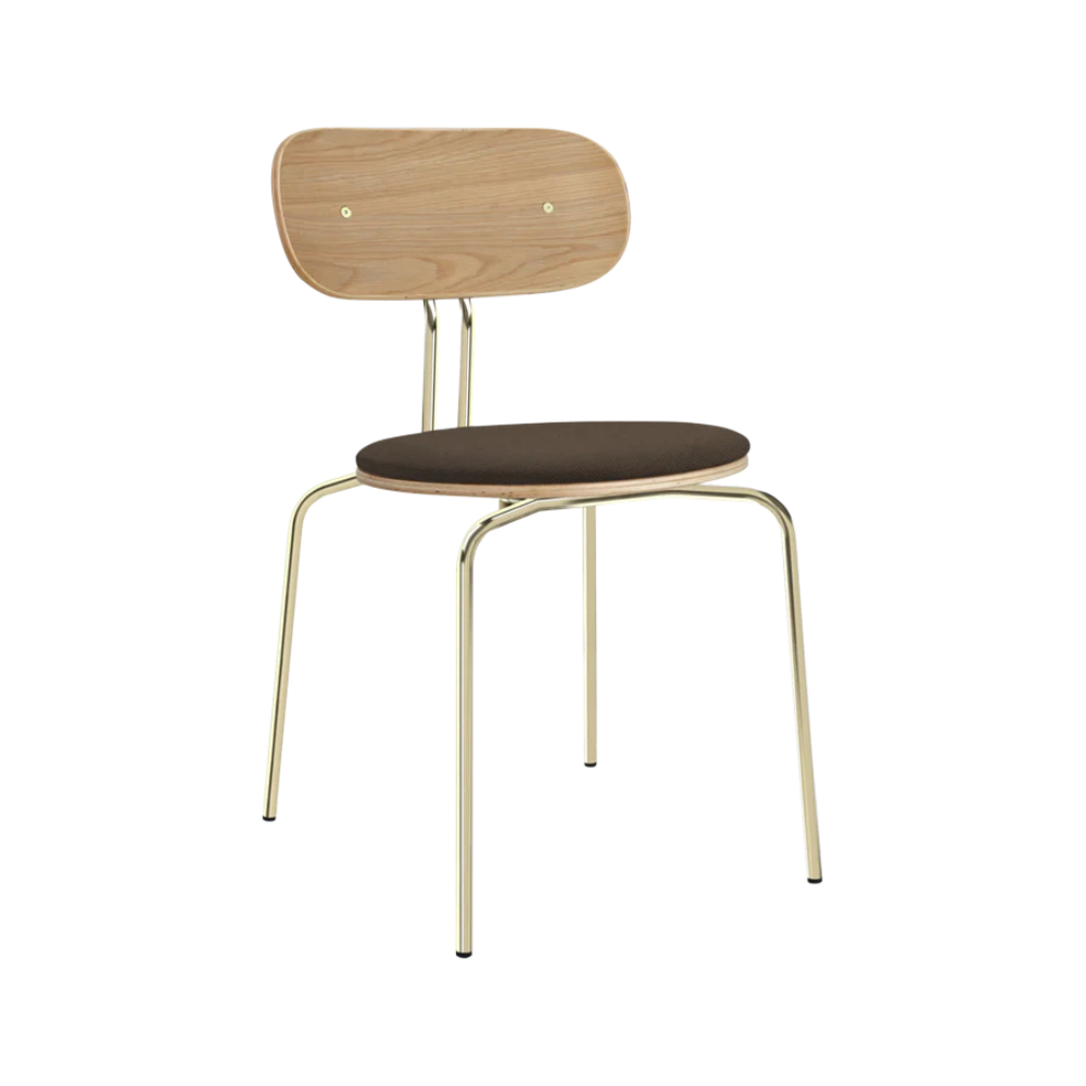 Umage Curious spisebordsstol forener skandinavisk elegance med øget komfort. Stolen har et sæde i egefiner med messingstel og er opgraderet med en blød polstring i genanvendt polyester, som både tilfører taktilitet og bæredygtighed.