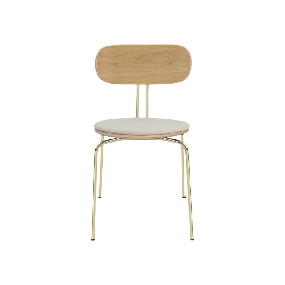 Umage Curious spisebordsstol forener skandinavisk elegance med øget komfort. Stolen har et sæde i egefiner med messingstel og er opgraderet med en blød polstring i genanvendt polyester, som både tilfører taktilitet og bæredygtighed.