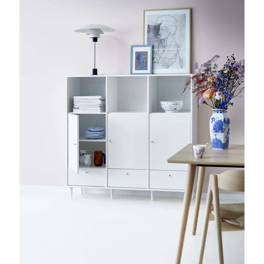 13.337,00 DKKUdsalgspris 9.335,90 DKKSkænken består af 3 låger i reolen sammen med 3 skuffer nederst. Der medfølger 6 stk. ben i snehvid til.-30% -
