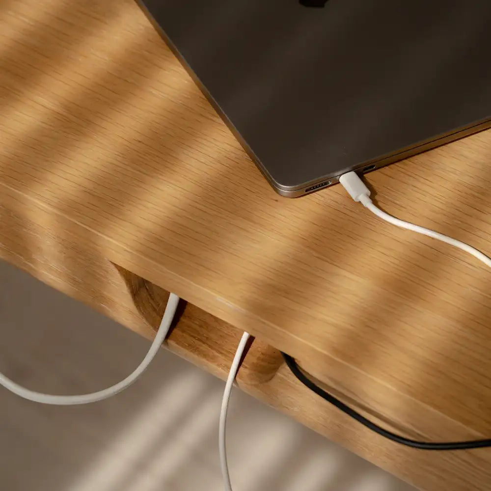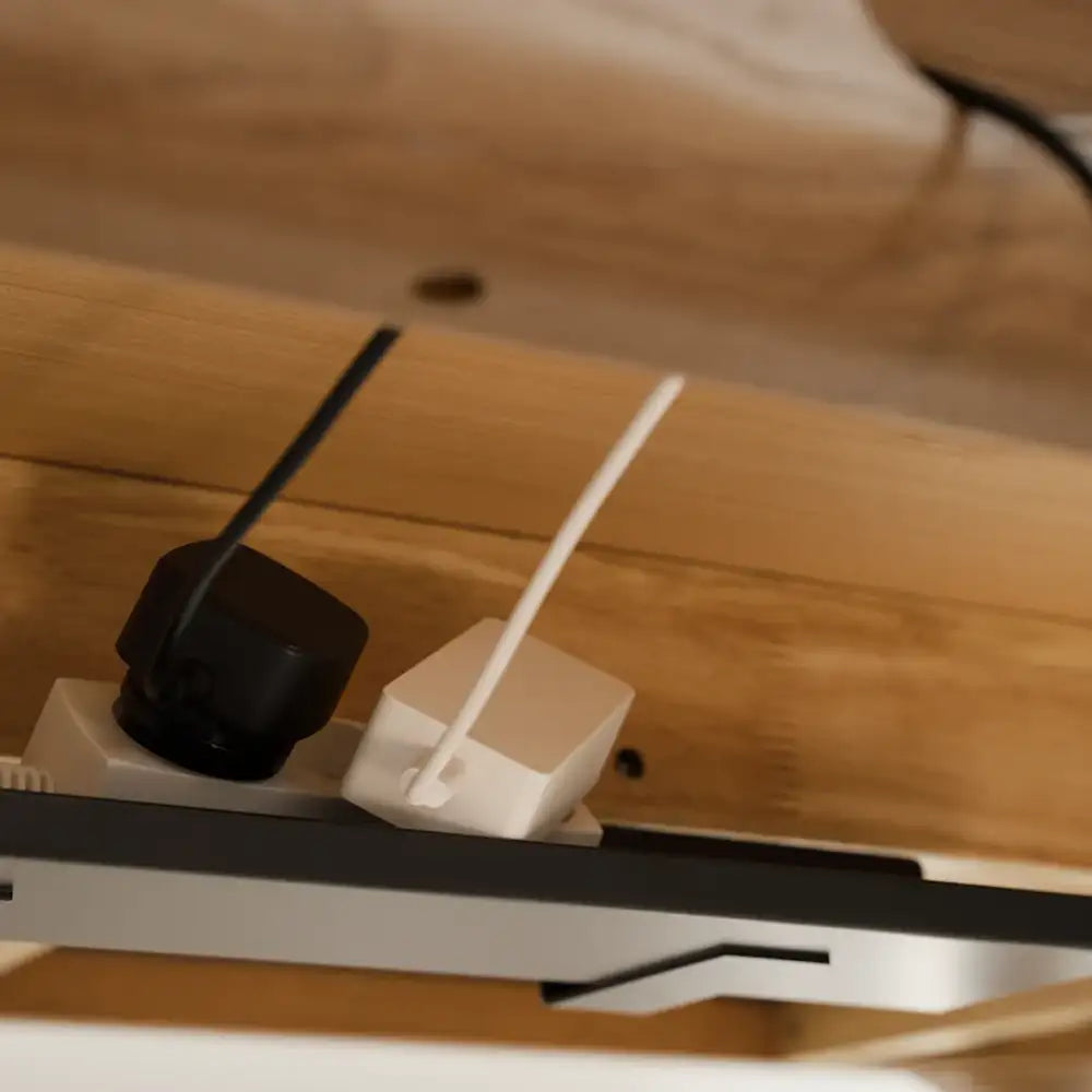 De to rummelige skuffer giver dig plads til opbevaring af kontorartikler, opladere og hverdagens nødvendigheder – alt sammen lige ved hånden, men ude af syne. Den integrerede kabelbakke skjuler ledninger og opladere og sørger for, at bordpladen altid fremstår ryddelig og indbydende.