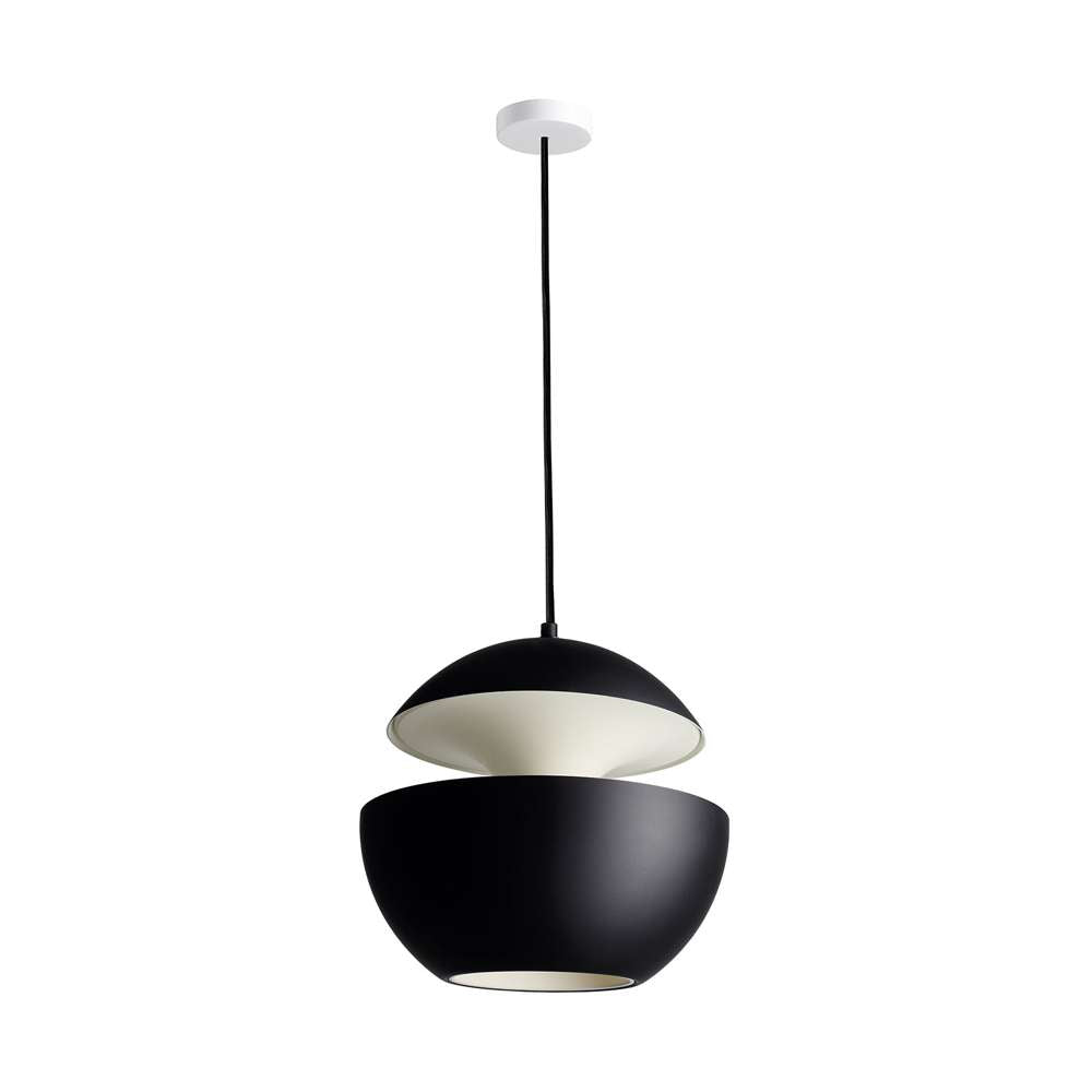 Aluminium pendant lamp. Inspired by the setting sun, it can be arranged alone or in a cluster and is available in several sizes and colours. At first glance, this original lamp looks like all the so-called original lamps. But when turned on, the Here Comes the Sun pendant lamp becomes magical. The night becomes gentle and reassuring.
