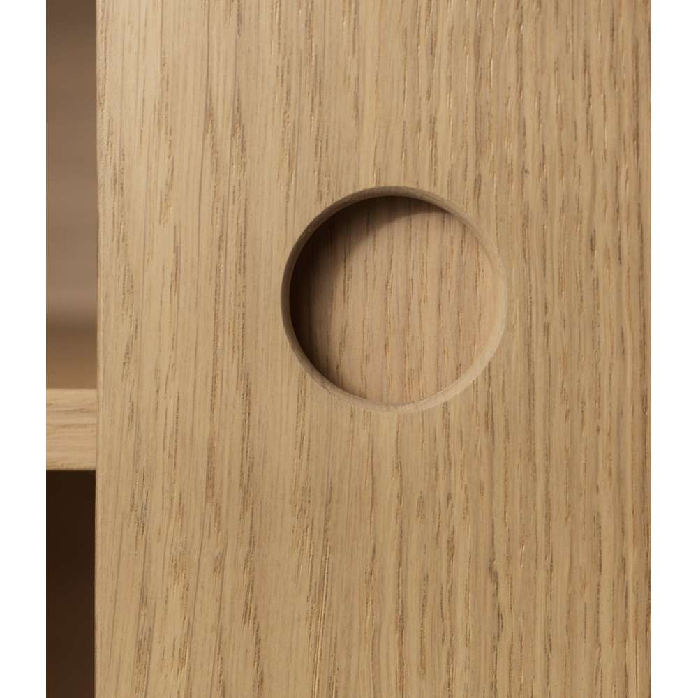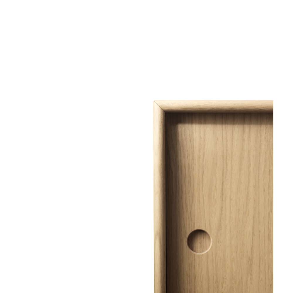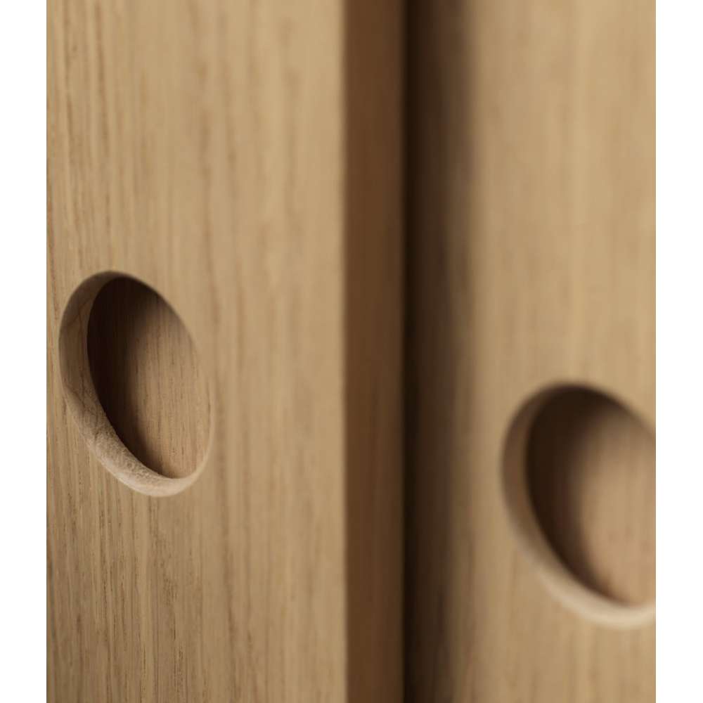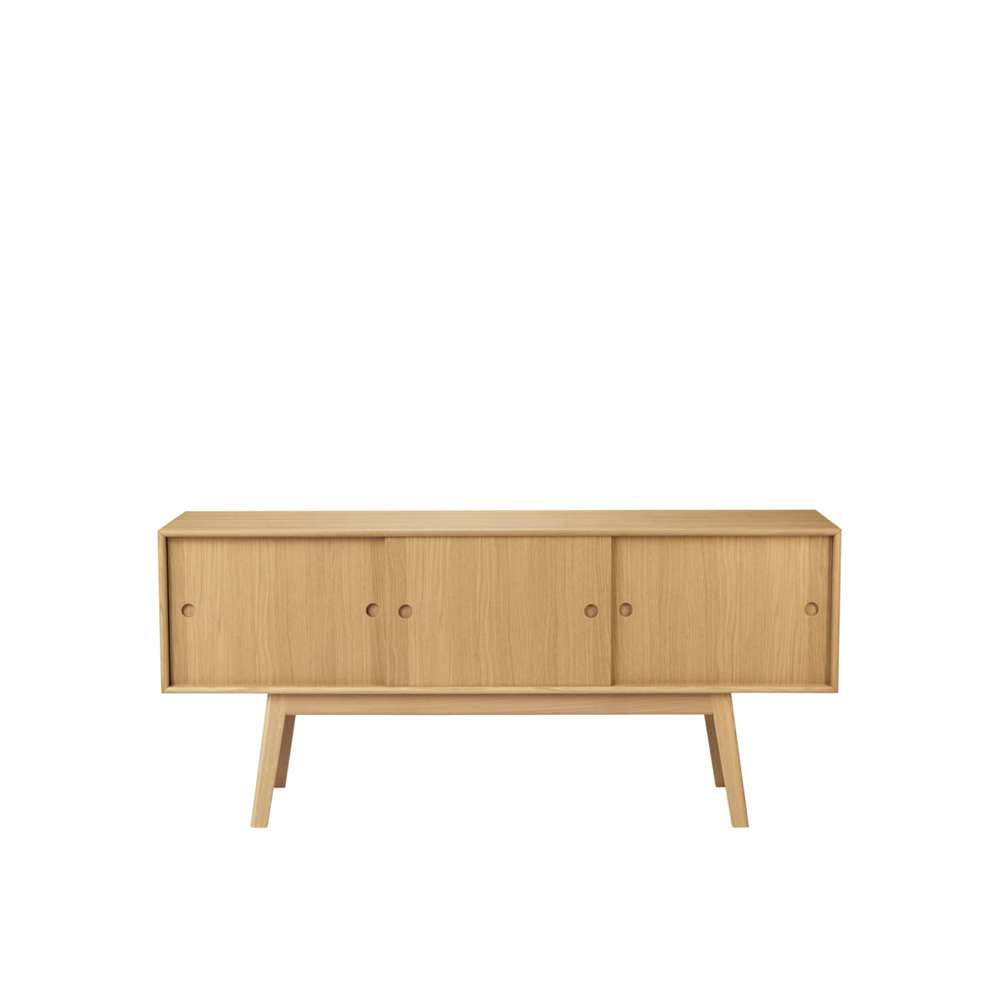 Skænken er udført i massiv lakeret eg og har tre skydedøre, som skjuler i alt seks rummelige opbevaringsrum. De rene linjer og høje sokler giver møblet et let og svævende udtryk, og lågerne kan vælges i flere farver, så skænken kan tilpasses din indretning.
