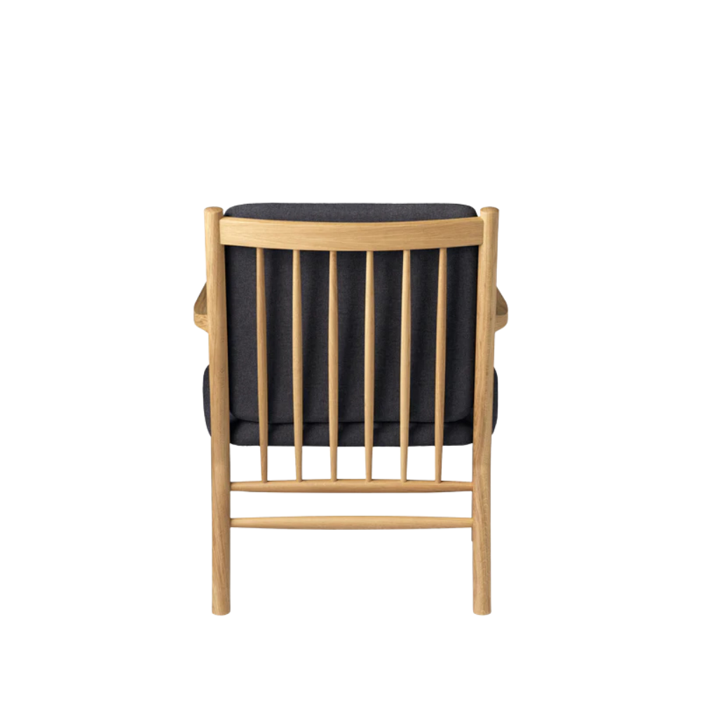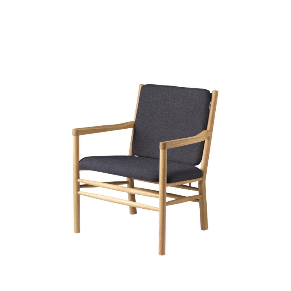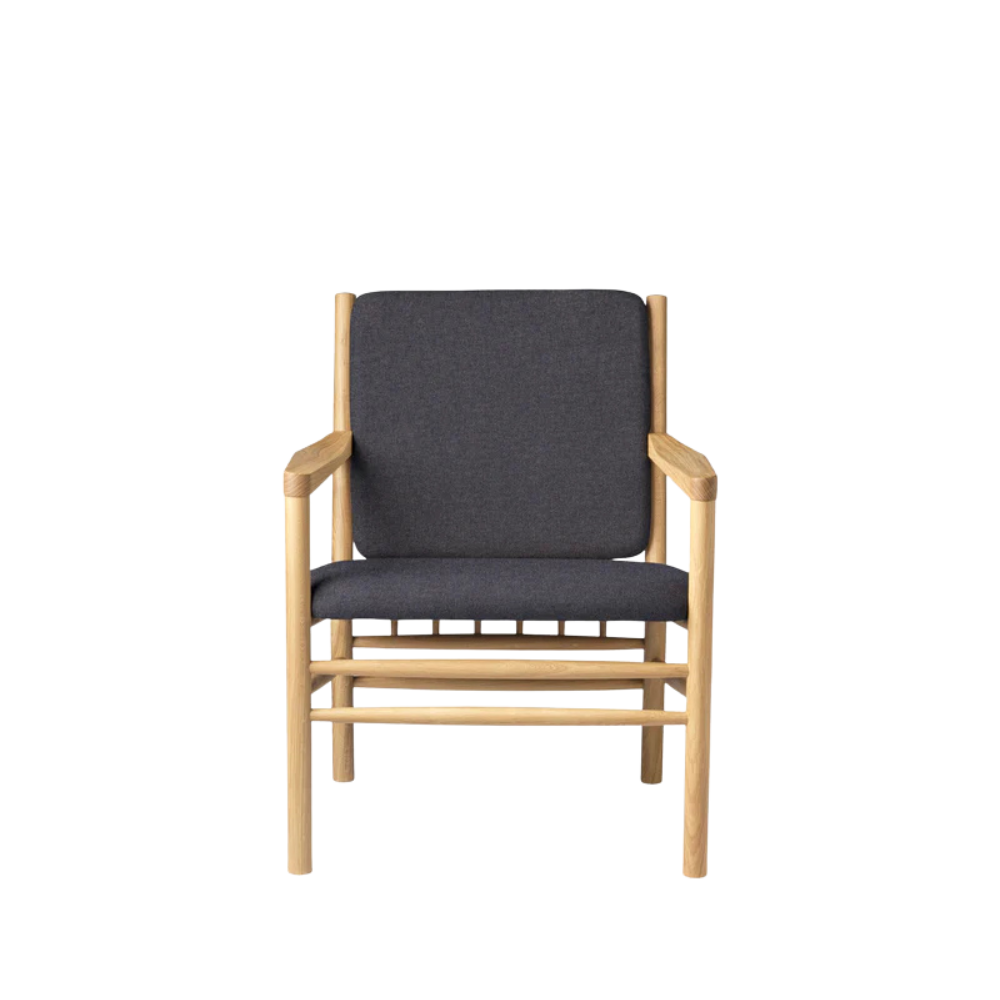 Den solide ramme i massiv lakeret eg kombineres her med det bæredygtige tekstil Main Line Flax – et slidstærkt og miljøvenligt materiale, der giver stolen et naturligt og sanseligt udtryk. De bløde linjer og den generøse siddekomfort gør J147 til et møbel, du har lyst til at blive i.