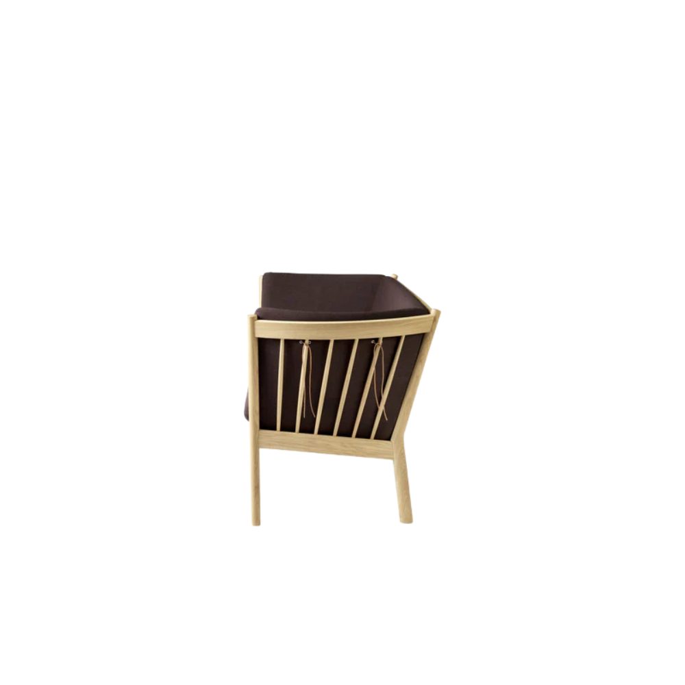 Stellet er fremstillet i lakeret eg og bærer præg af det solide håndværk, som FDB Møbler er kendt for. De bløde hynder er betrukket med en slidstærk uldblanding fra Gabriel, som sikrer både komfort og æstetik i hverdagen.