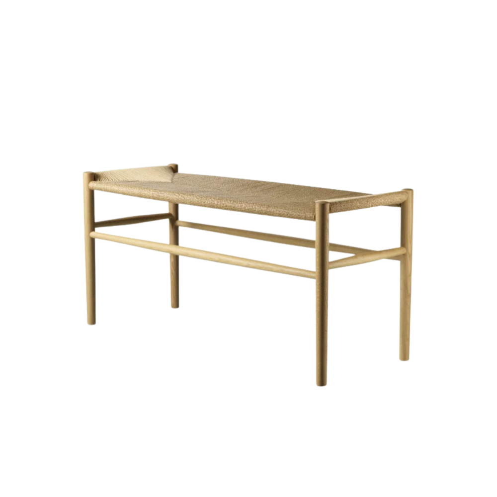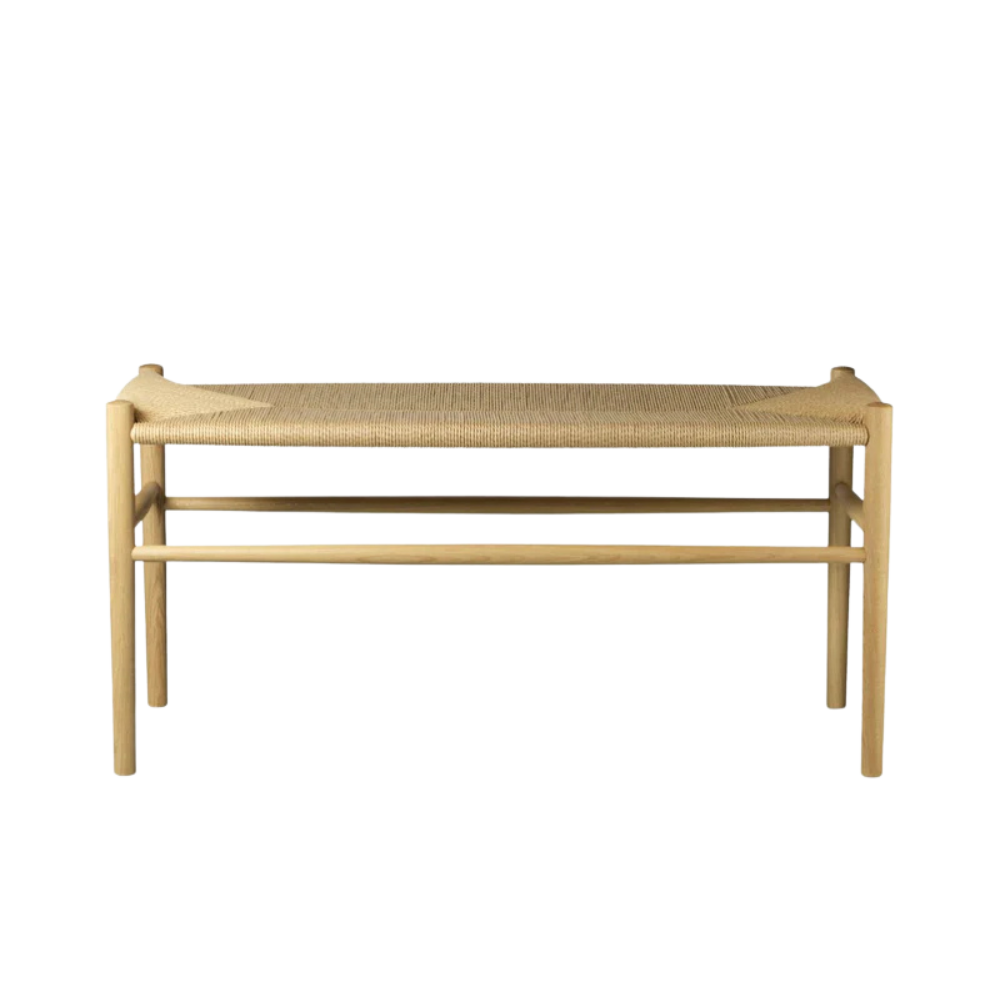 Denne version er udført i lakeret vandbaseret massiv eg og har et håndflettet sæde – en kombination, der giver møblet et blødt og moderne udtryk. Den forhøjede siddehøjde gør den velegnet både til klaverbrug og som bænk ved spisebordet eller i entréen.