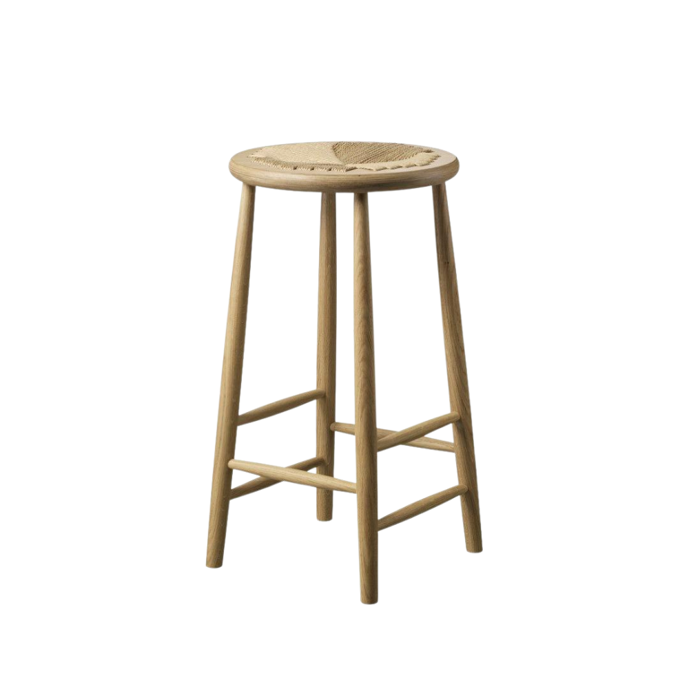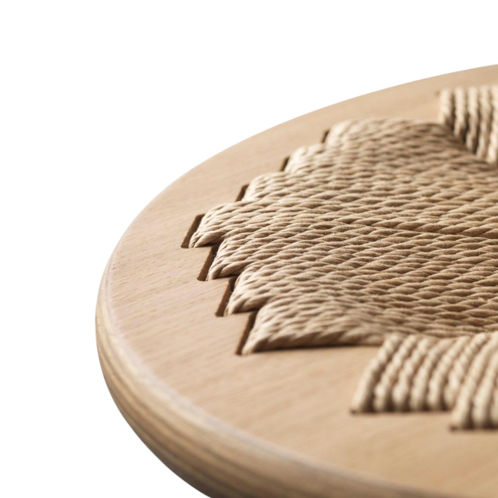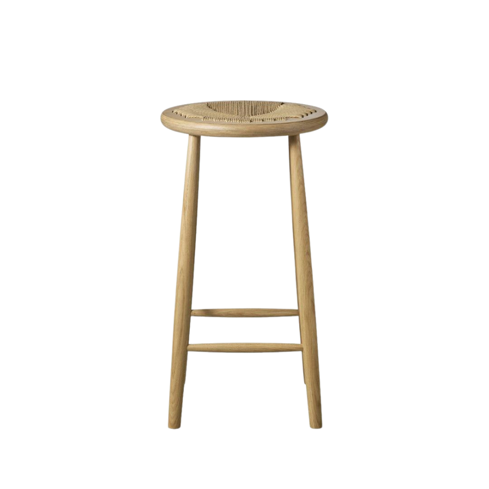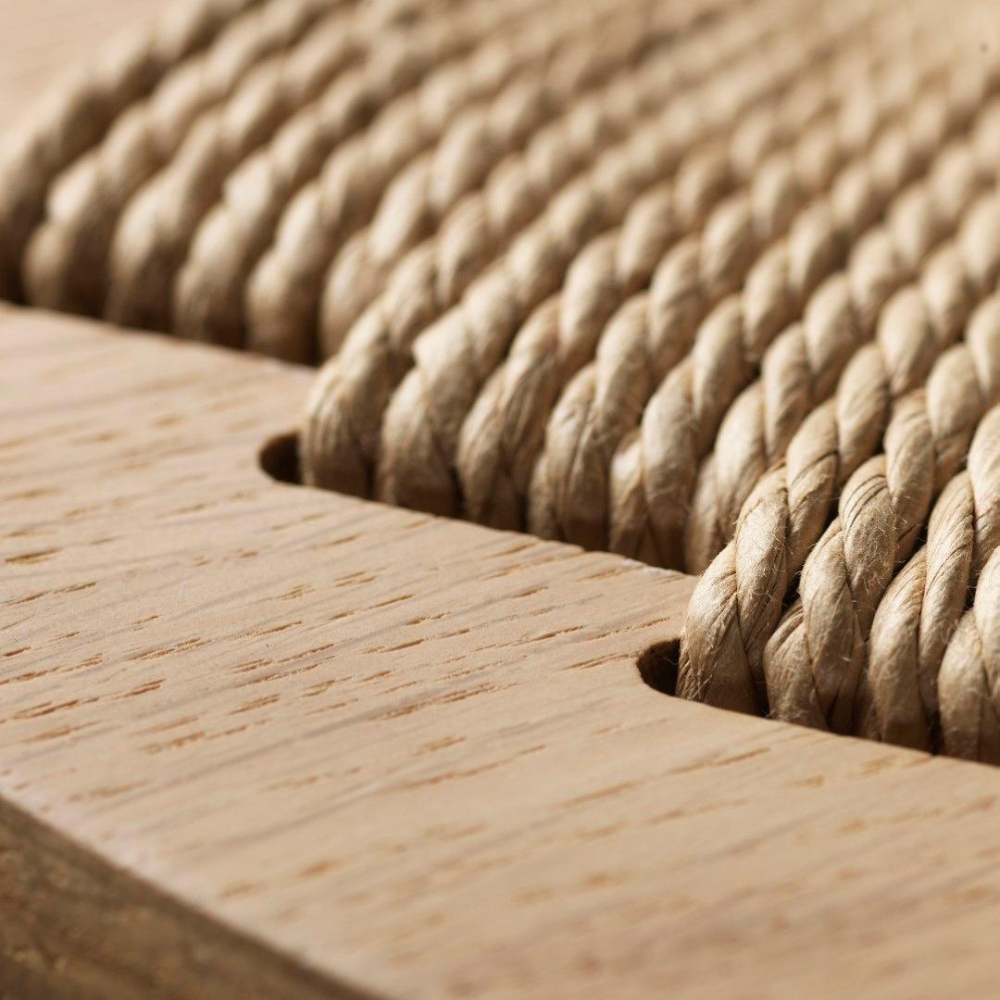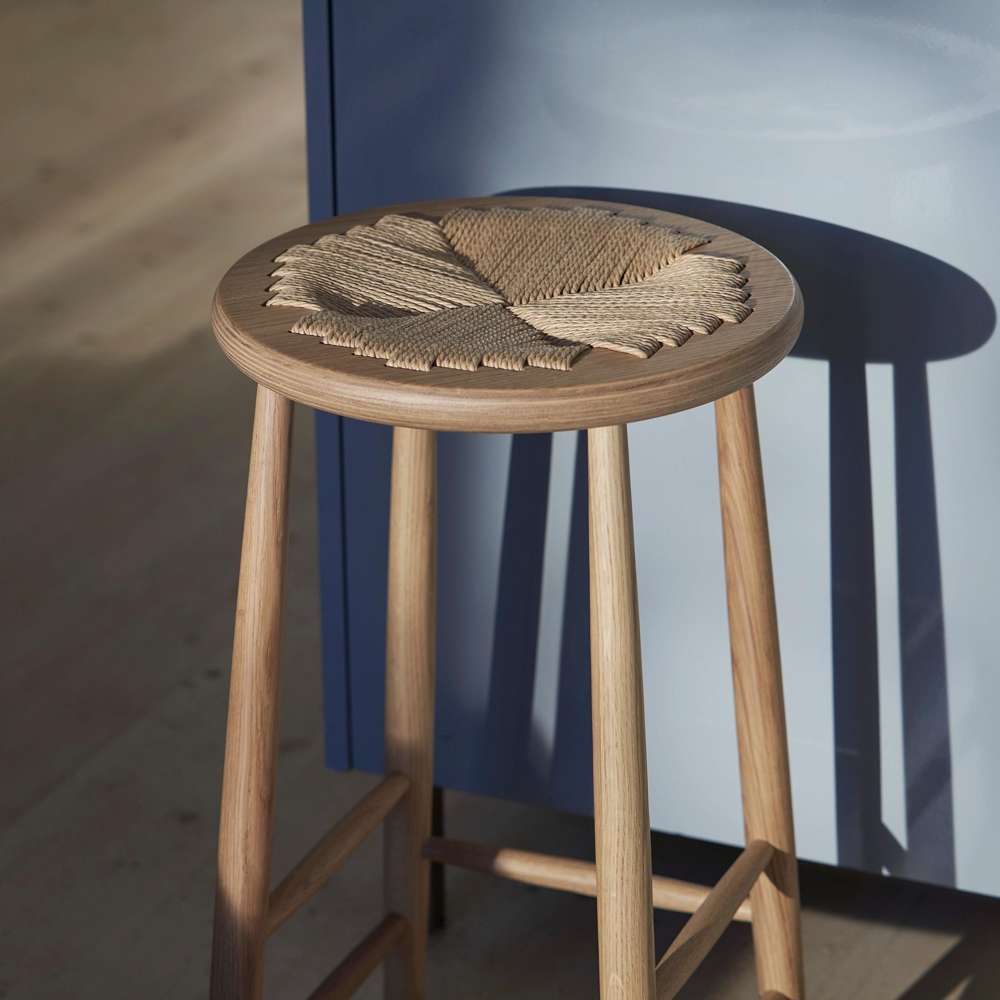 Designet er tro mod den danske møbeltradition med sin enkle form, solide materialer og sans for detaljen. Den lakerede ramme i massiv eg står i fin kontrast til det håndflettede sæde i naturfarvet papirsnor, som både er smukt og behageligt at sidde på.