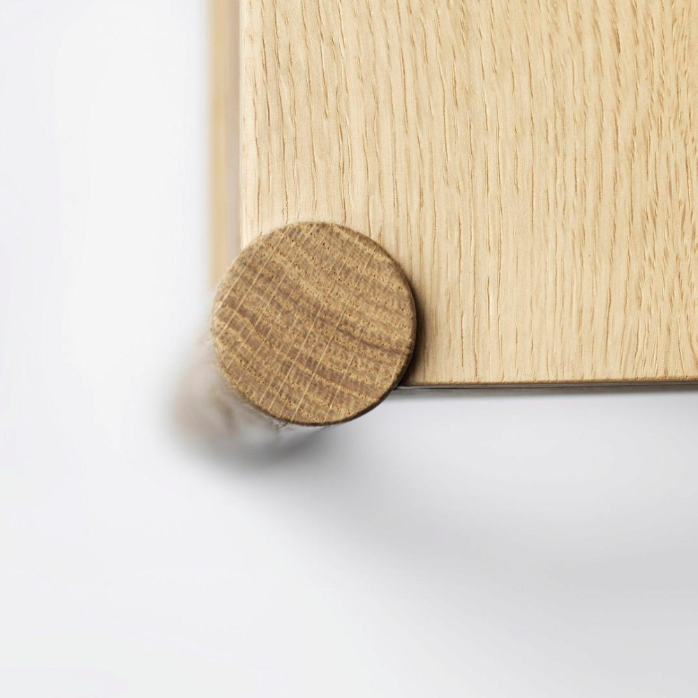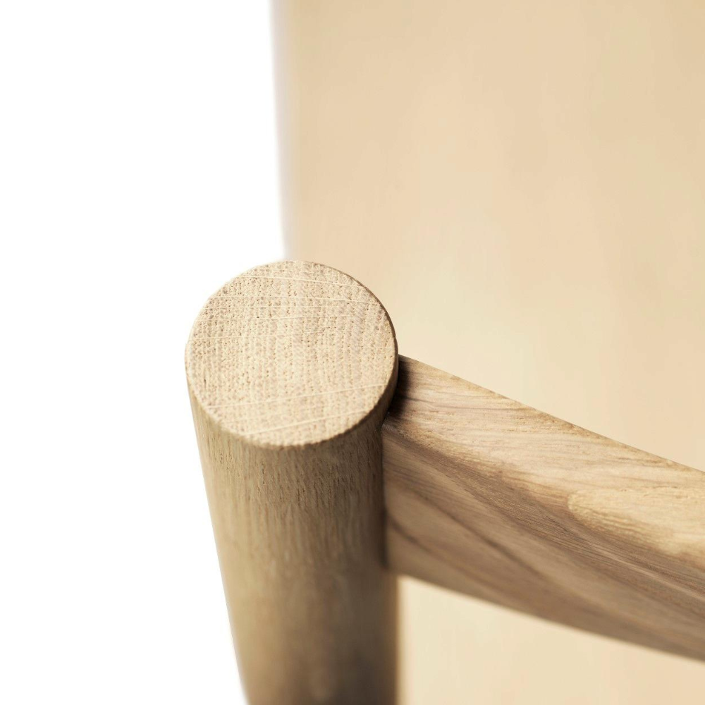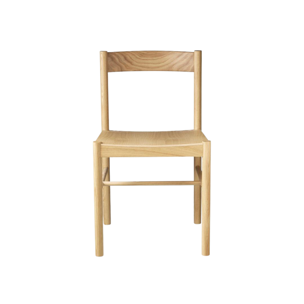 Stolen er fremstillet i massiv eg og behandlet med en miljøvenlig, vandbaseret lak, der fremhæver træets naturlige varme. Sædet er udført i eg finér, som giver en elegant og diskret kontrast til stellets mere markante struktur.