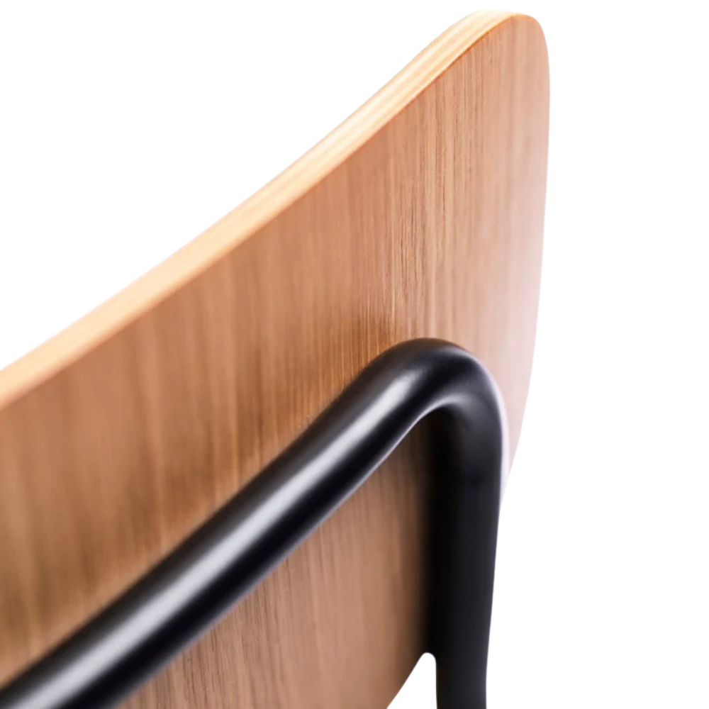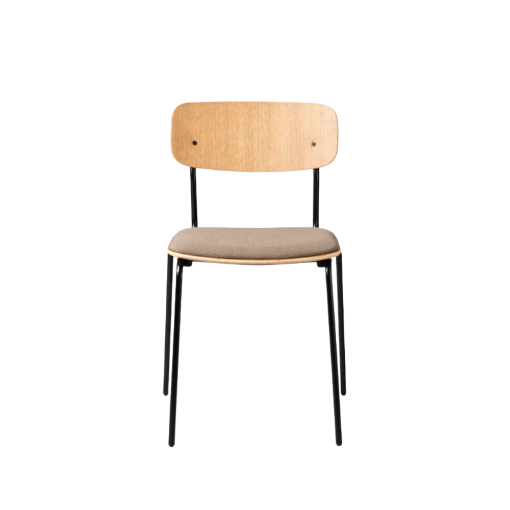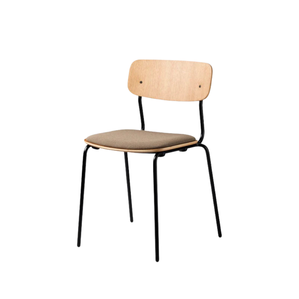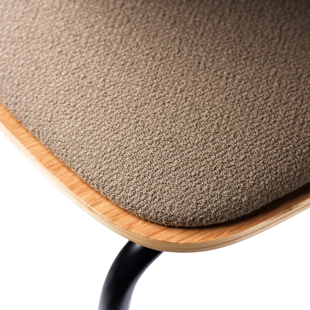 Den enkle konstruktion i pulverlakeret stål giver stolen sin karakteristiske silhuet og gør den robust i daglig brug. Sædet i eg finér tilfører varme og struktur, mens den bløde polstring gør stolen ideel til lange middage og hyggelige stunder ved spisebordet.