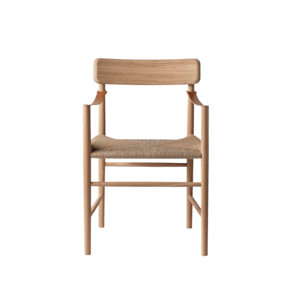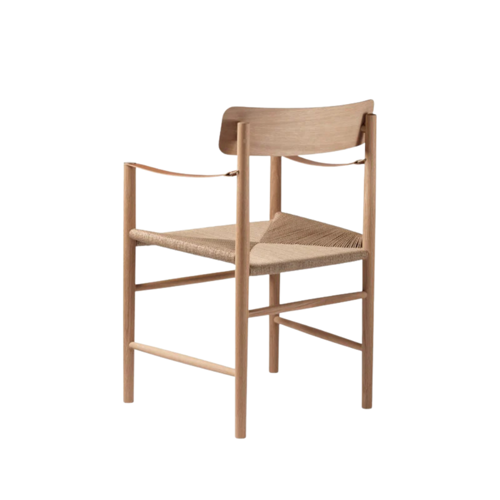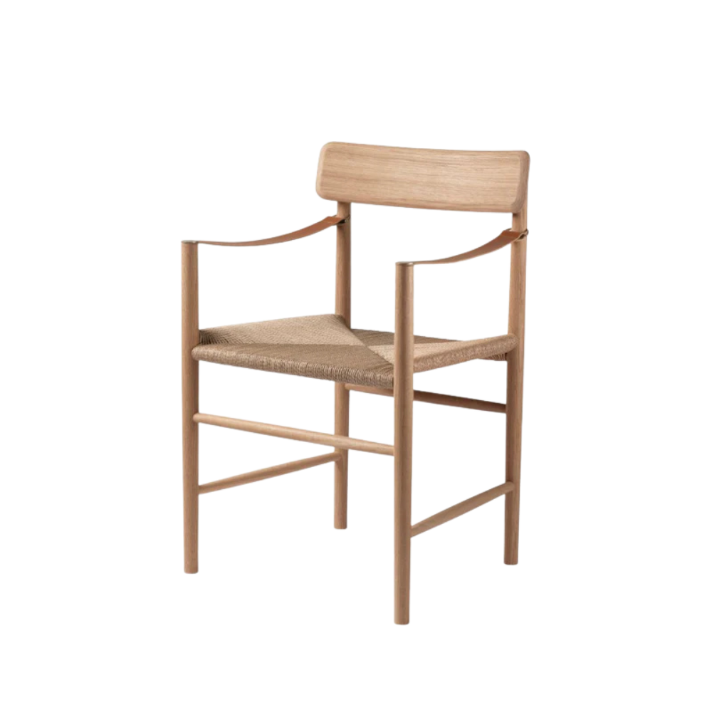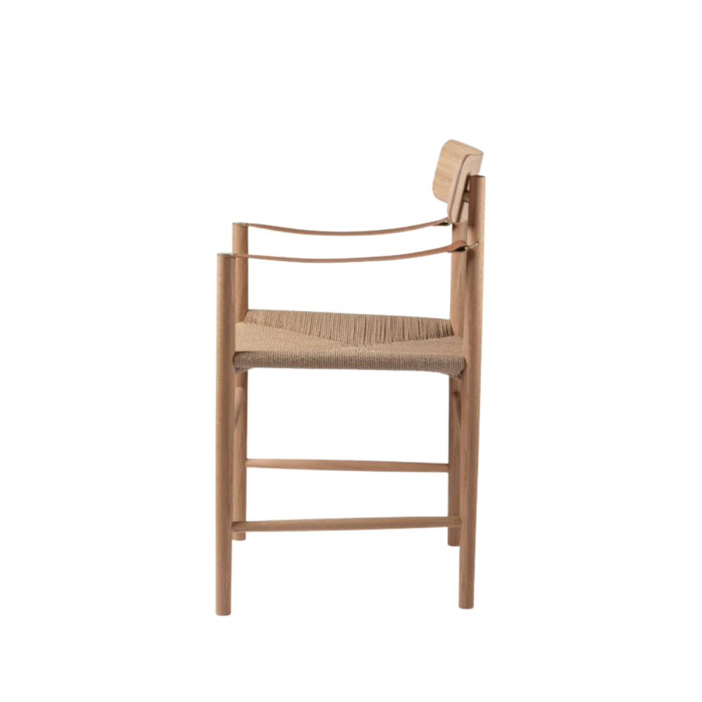 Hesbjerg spisebordsstol er en hyldest til traditionelt dansk møbelhåndværk. Fremstillet i massiv, olieret eg med et flettet sæde i papercord og armlæn i kernelæder, forener stolen naturlige materialer med en tidløs elegance.