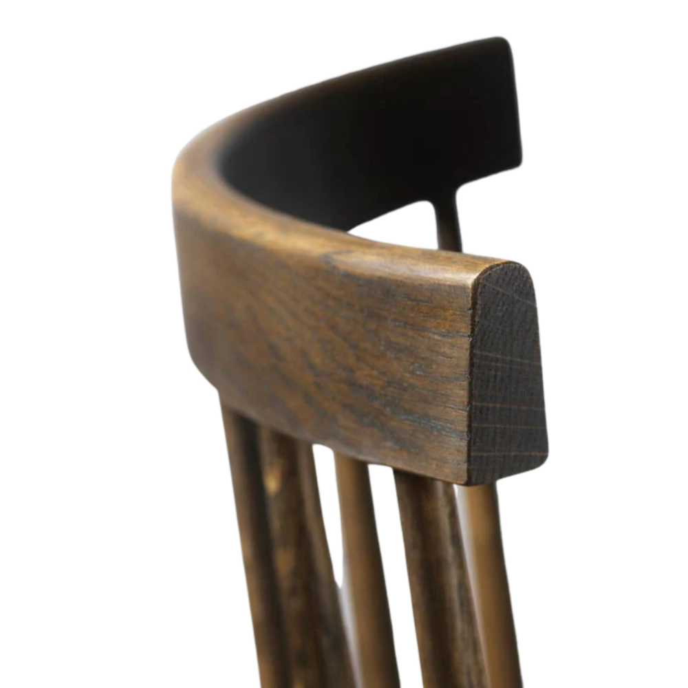 Med sin højde på 80 cm og sædehøjde på 44 cm sætter den nye standard i komfort og proportionssans. Den solide, men lette opbygning gør, at stolen fremstår både robust og elegant. Røgfarvningen binder trækvaliteten sammen med et moderne, stilrent hjem – fra det nordiske til det mere rustikke.