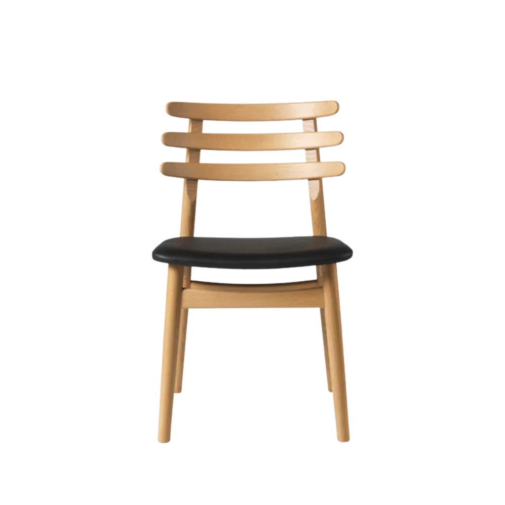 Den er fremstillet i massivt, olieret egetræ med FSC-certificering, hvilket sikrer både styrke og bæredygtighed. Det læderpolstrede sæde tilfører varme og elegance – en detalje, der gør stolen både indbydende og slidstærk.