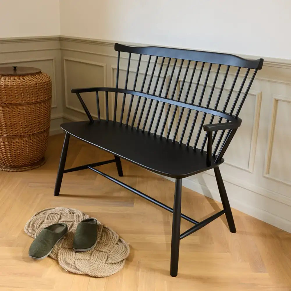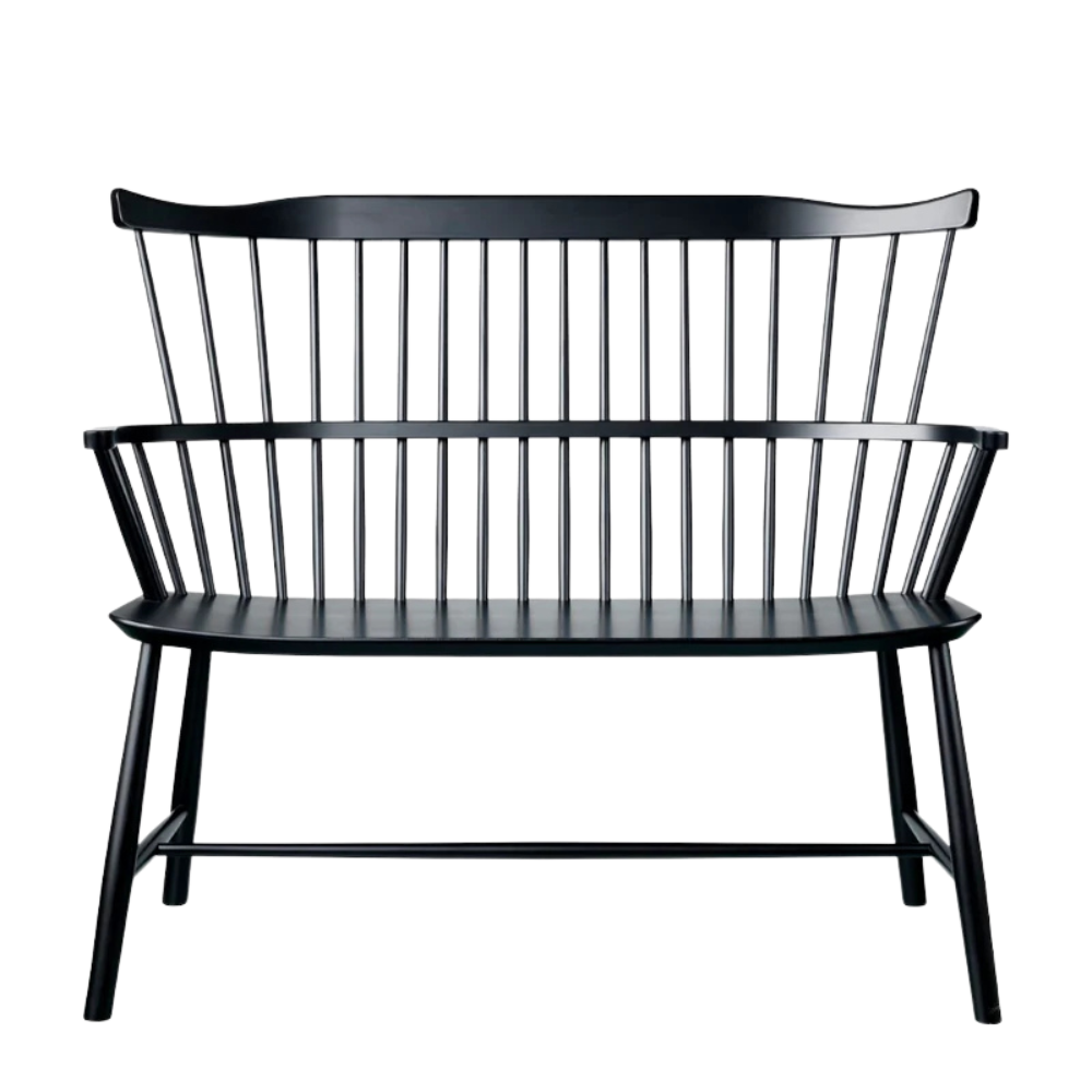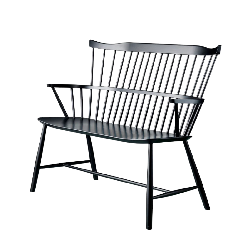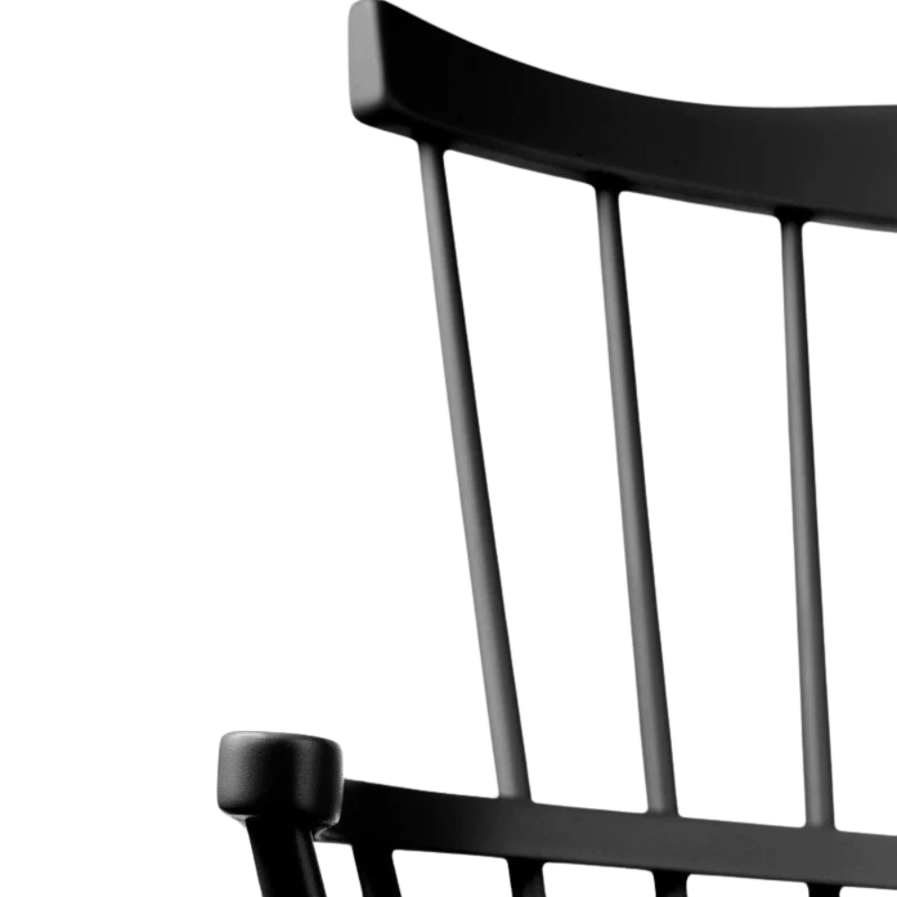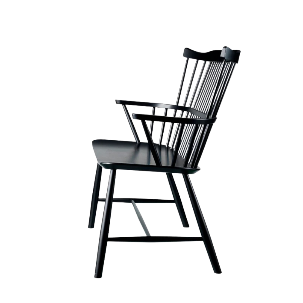 Udført i sortlakeret massiv bøg og med et højt ryglæn i rundstokke, får J52D et både let og skulpturelt udtryk. Den rummelige siddeflade og de let skrånende armlæn sikrer behagelig støtte og god siddekomfort – perfekt ved spisebordet, i entréen eller som en ekstra siddeplads i stuen.