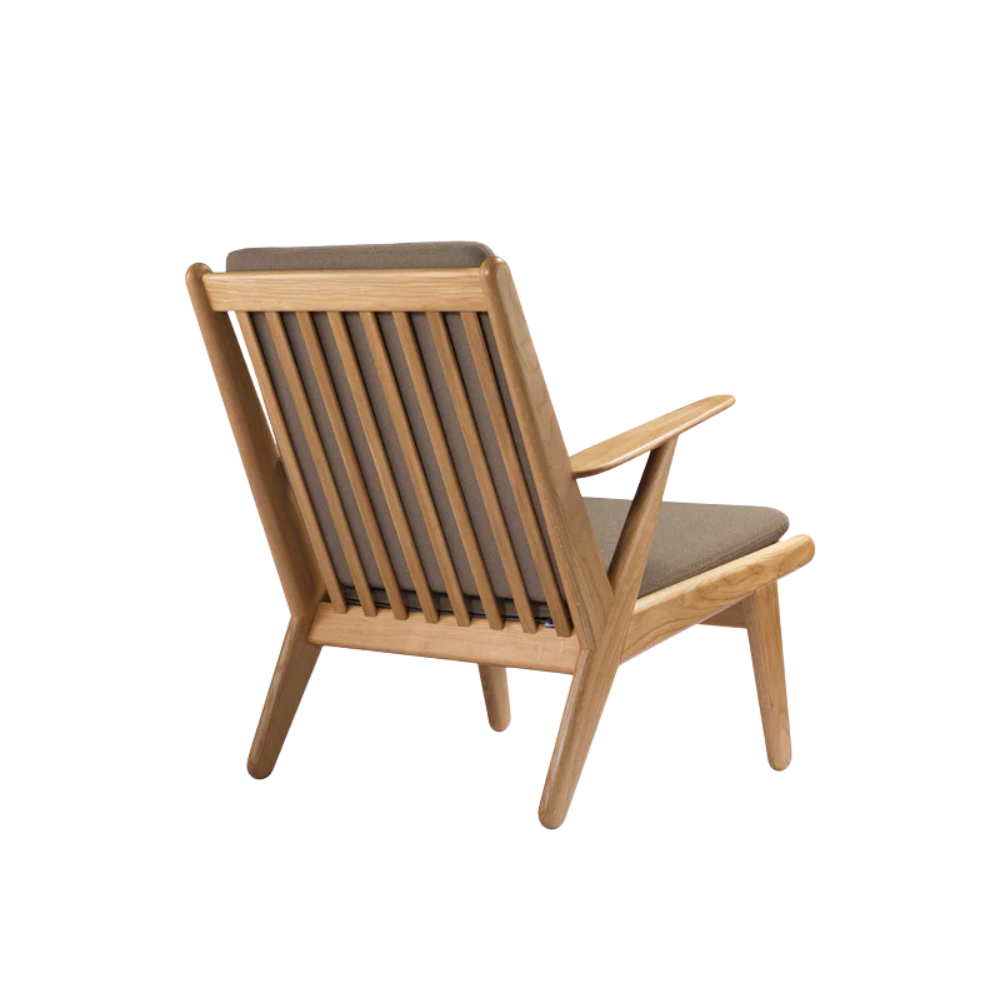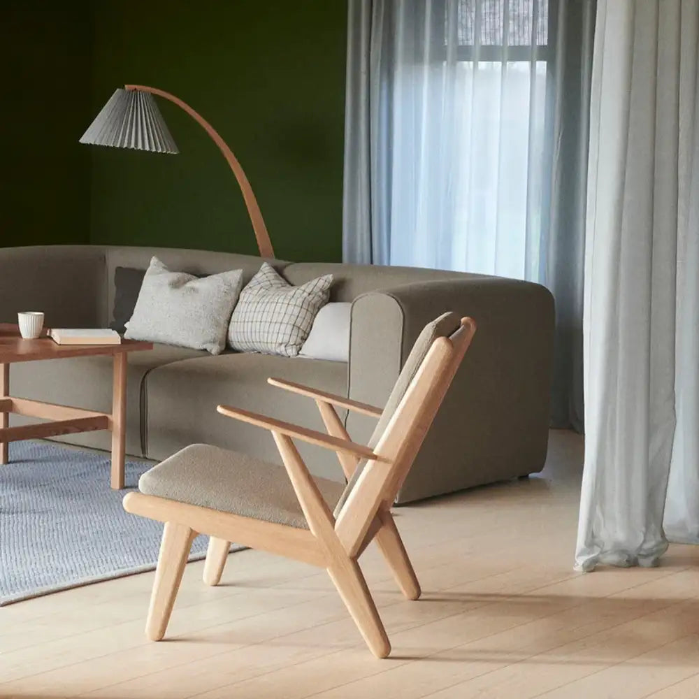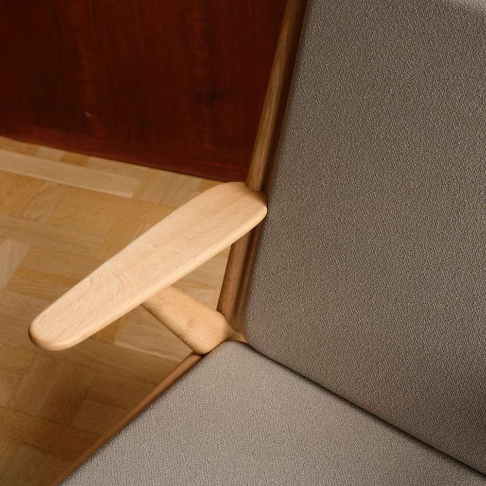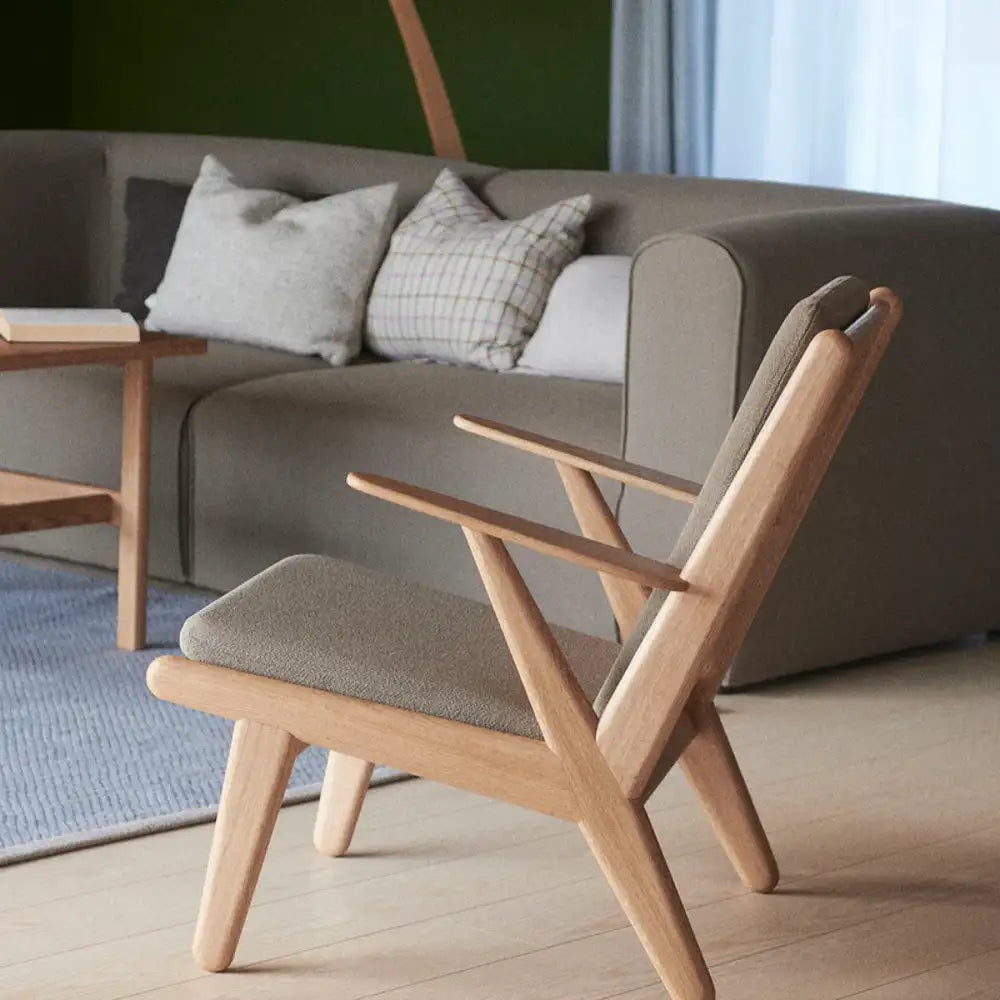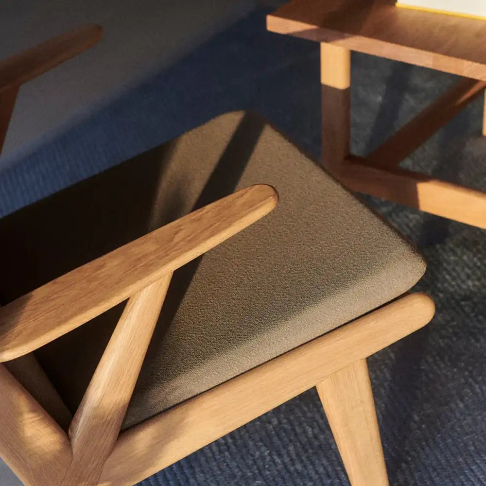 Udført i massivt, olieret egetræ og betrukket med det karakterfulde Gabriel Grain-tekstil, kombinerer denne variant både naturlighed og tekstilrig taktilitet. Hver detalje er gennemtænkt, fra det enkle stel til den komfortable siddeposition.