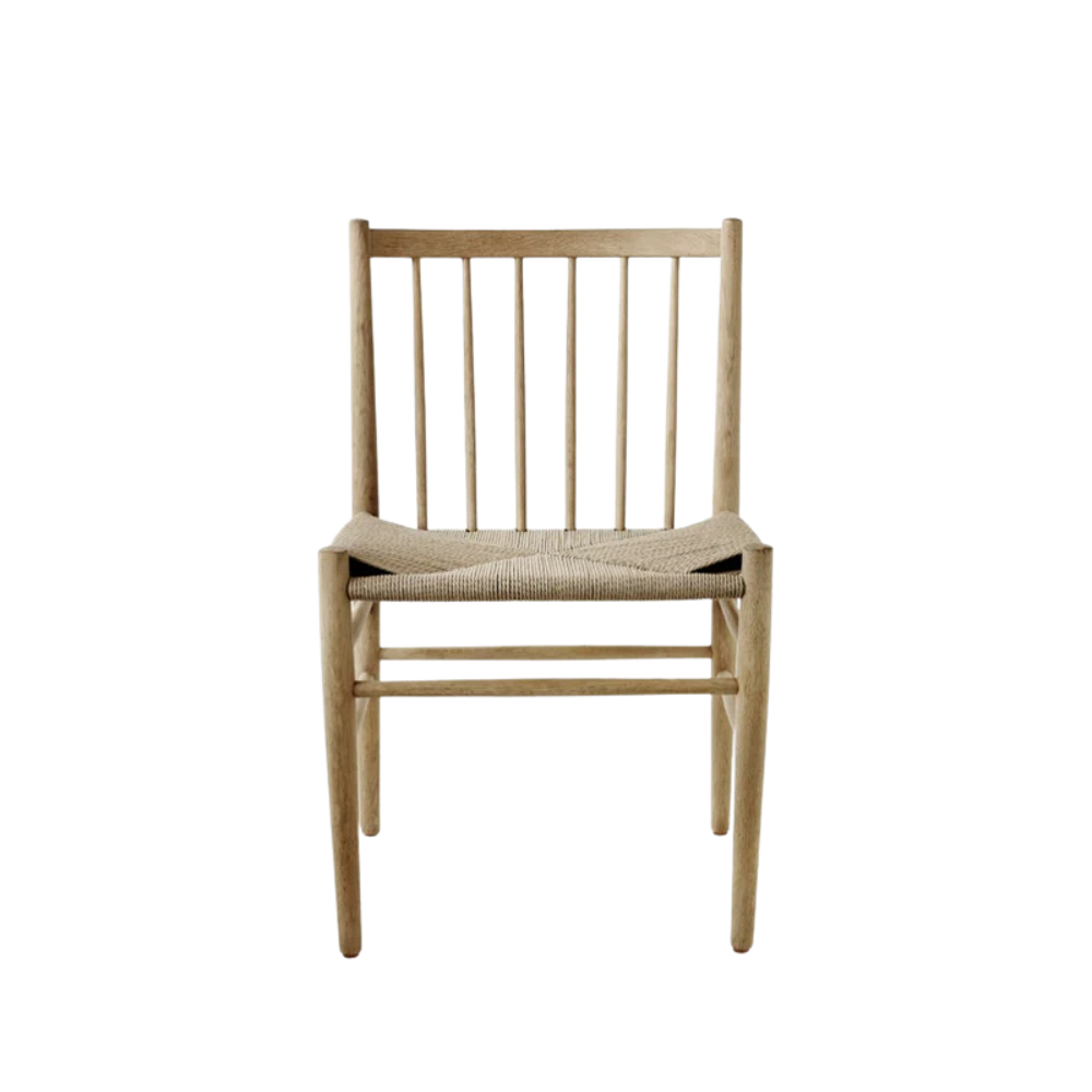 Denne variant er fremstillet i olieret massiv eg og har et håndflettet sæde i papercord, som både tilfører varme og tekstur til udtrykket. Materialevalget understreger stolens klassiske rødder og giver samtidig en moderne fornemmelse i rummet.