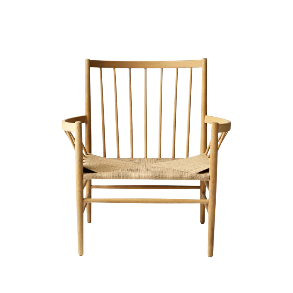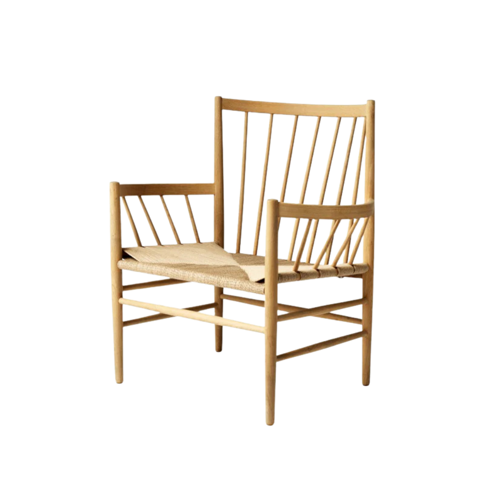 FDB J82 loungestol er designet af Jørgen Bækmark og er en naturlig forlængelse af FDB’s ikoniske møbeltradition. Med sit lette udtryk, brede sæde og svungne armlæn indbyder stolen til afslapning – uanset om den står i stuen, læsehjørnet eller ved vinduet.