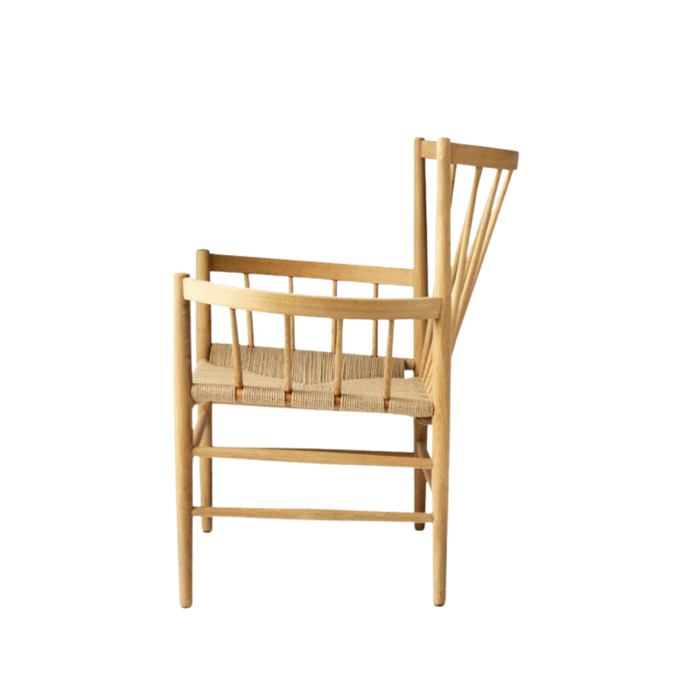 Denne variant er udført i massiv eg med en slidstærk, vandbaseret lak, der bevarer træets naturlige glød. Sædet er flettet i papercord, som giver både styrke og fleksibilitet – og understreger stolens håndværksmæssige kvalitet.