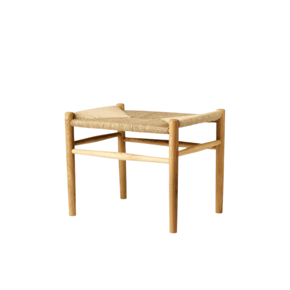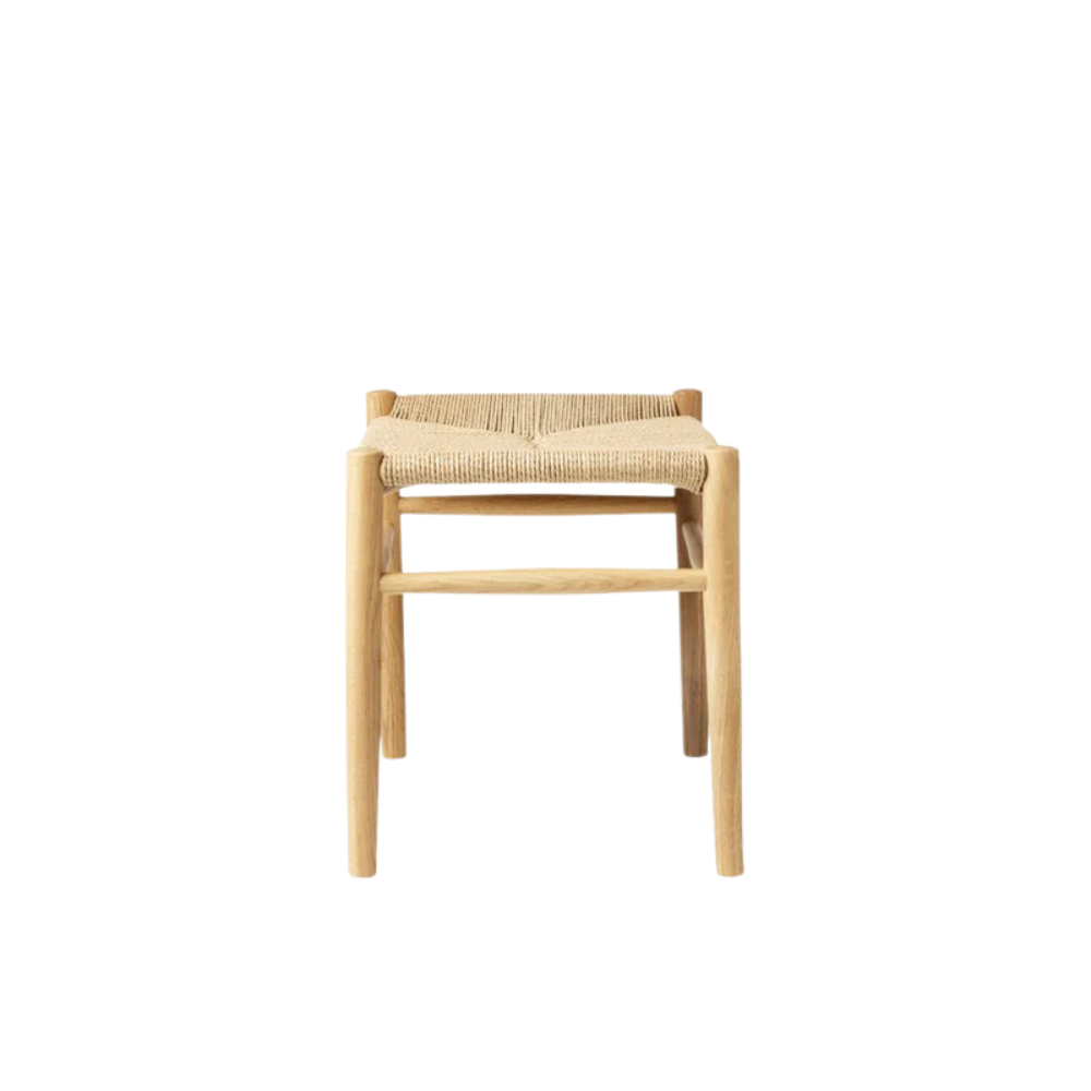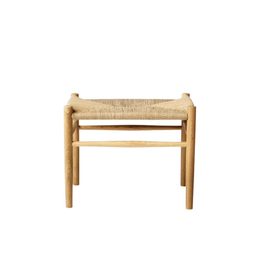 Skamlen er udført i massiv eg og behandlet med en vandbaseret lak, der beskytter træet uden at skjule dets naturlige struktur. Sædet er flettet i papercord – et både holdbart og smukt materiale, som giver en behagelig siddeoplevelse.