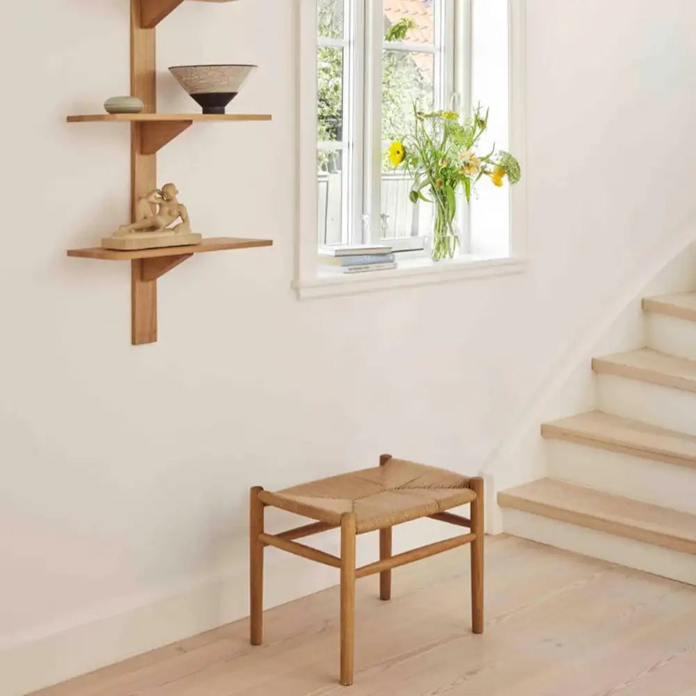 J83 kan bruges som ekstra siddeplads, som fodskammel eller som et enkeltstående designmøbel i entréen, soveværelset eller stuen. De enkle linjer og de naturlige materialer gør skamlen nem at kombinere med andre møbler.