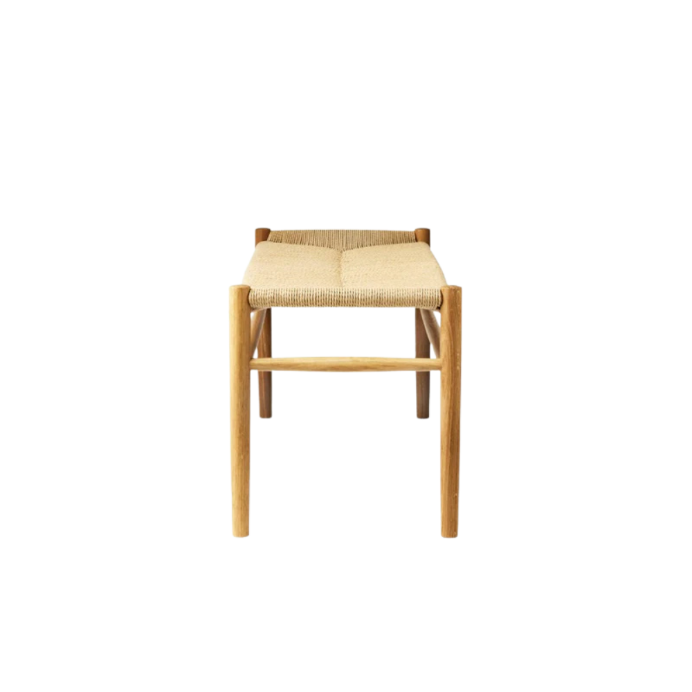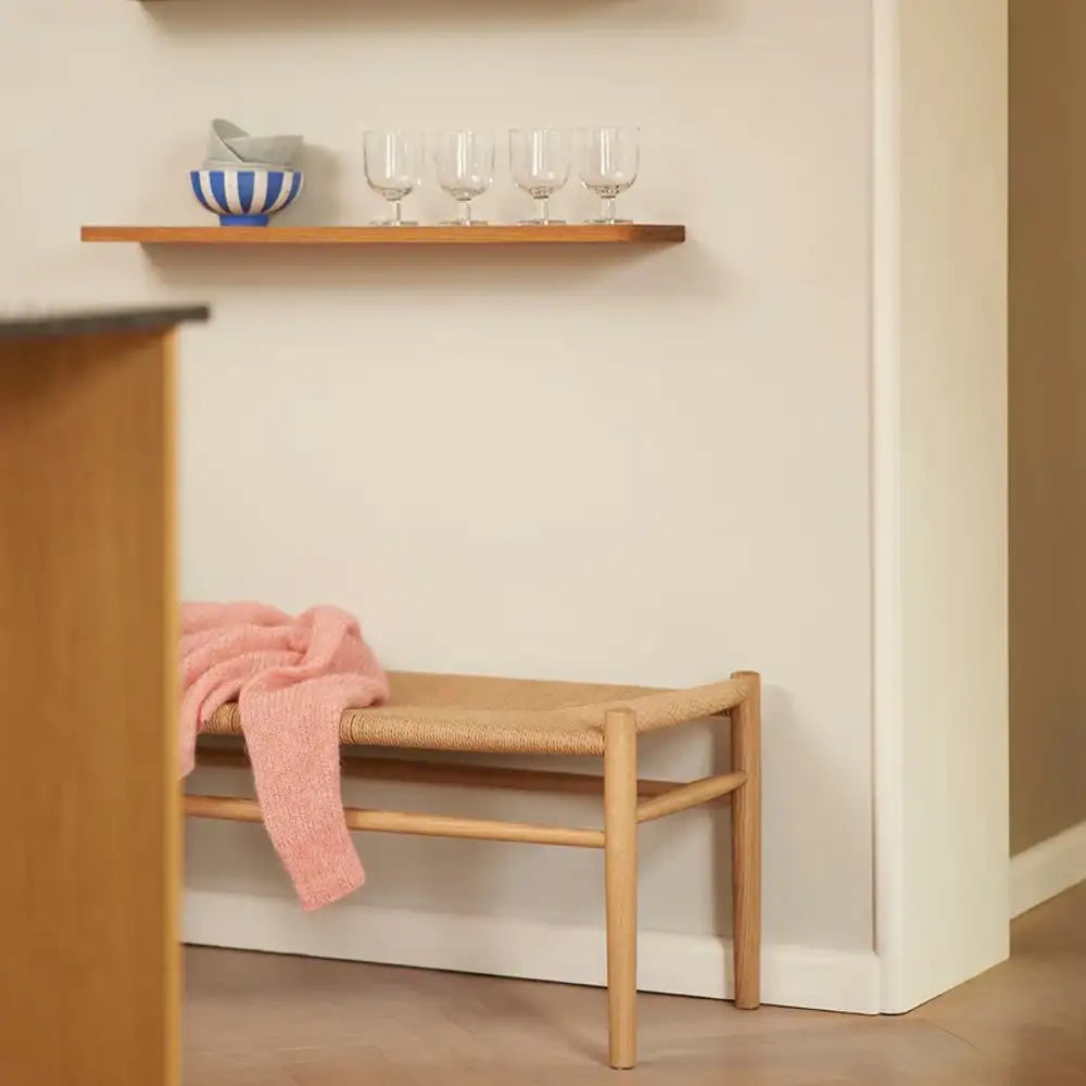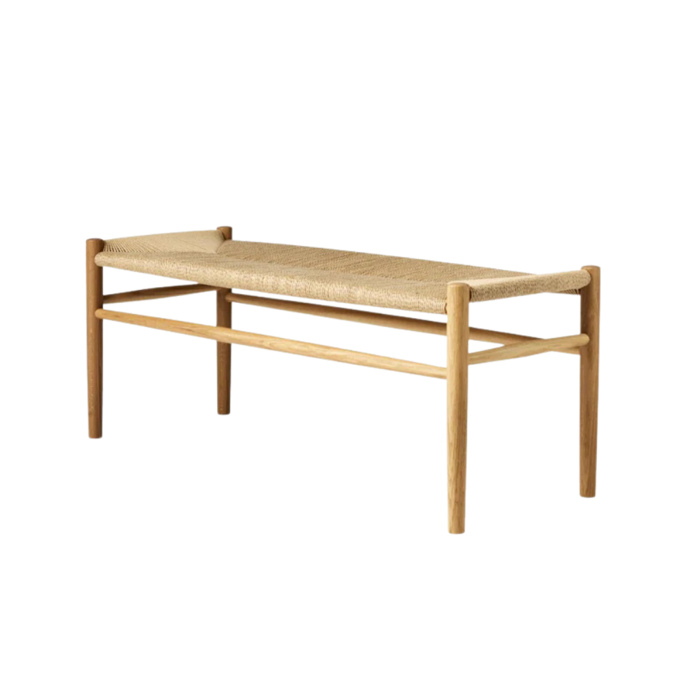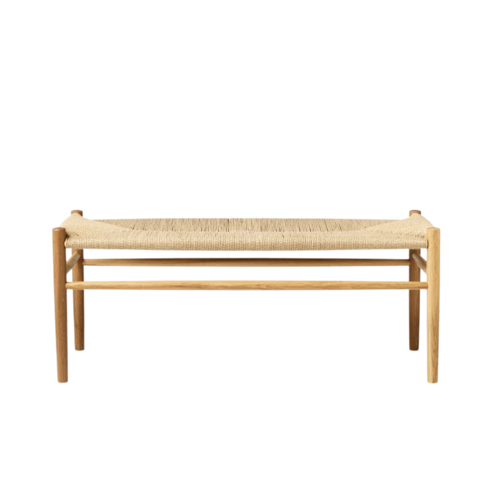 Bænken er fremstillet i lakeret, massiv eg og har et sæde i håndflettet papercord – et smukt og slidstærkt naturmateriale, der understreger det klassiske udtryk. Det lette design og de rene linjer giver bænken en diskret tilstedeværelse, der passer ind i både moderne og mere traditionelle indretninger.
