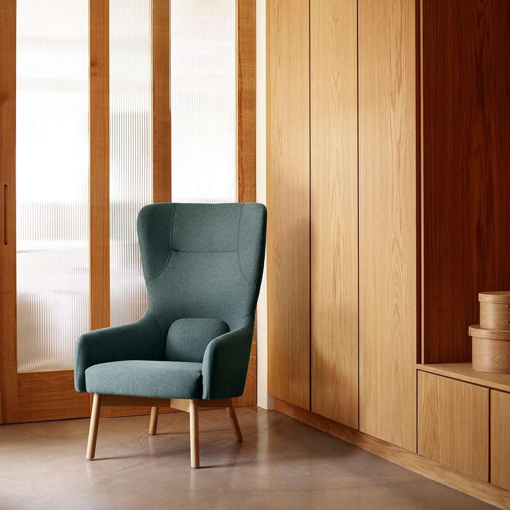 FDB L35 Gesja øreklapstol er designet til ro og fordybelse. Det høje ryglæn og de klassiske øreklapper skaber en afskærmet komfort, der gør stolen oplagt til læsehjørnet eller stille stunder.