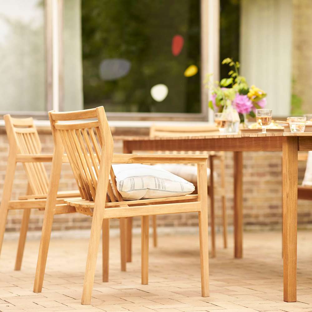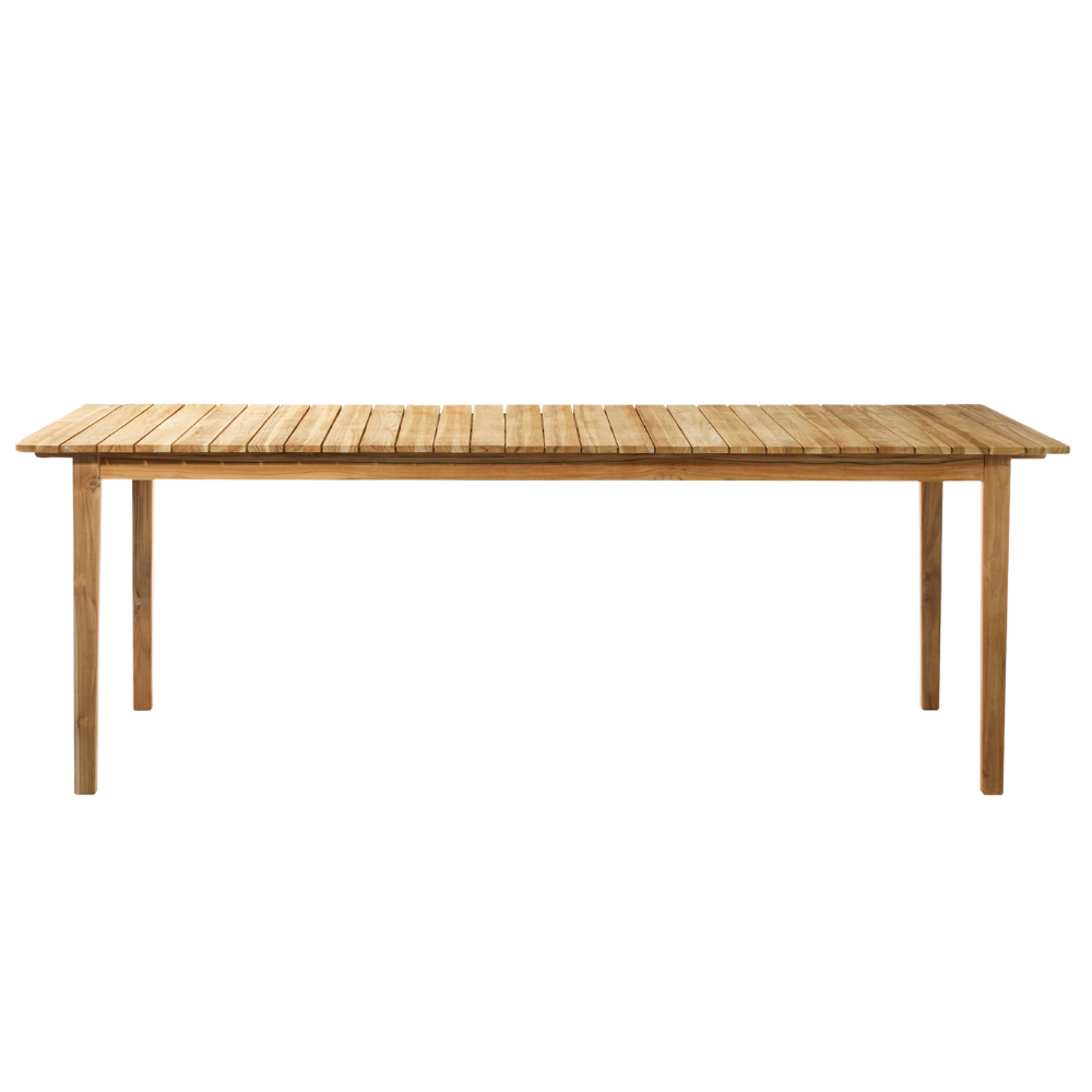 Havebordet er fremstillet i massiv teaktræ, som er kendt for sin styrke, holdbarhed og naturlige modstandsdygtighed over for vind og vejr. Den varme glød og de smukke åretegninger i træet fremhæves af den naturolierede overflade.