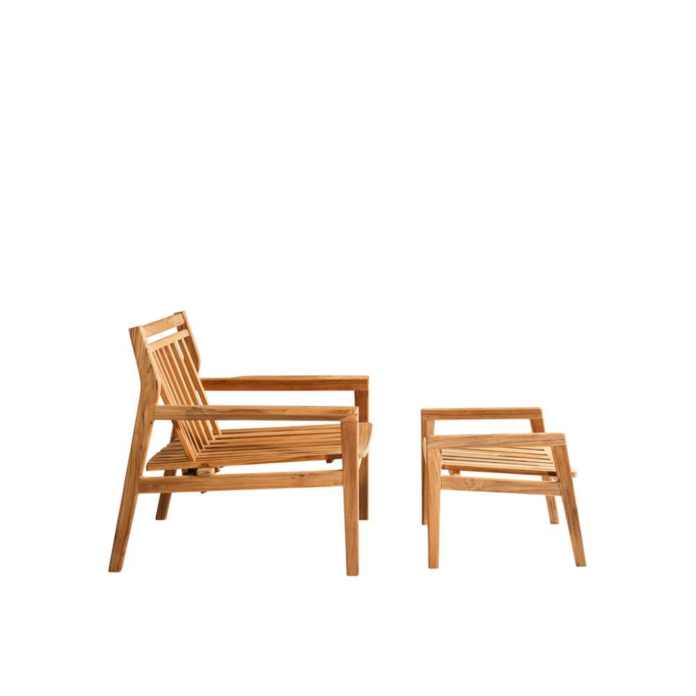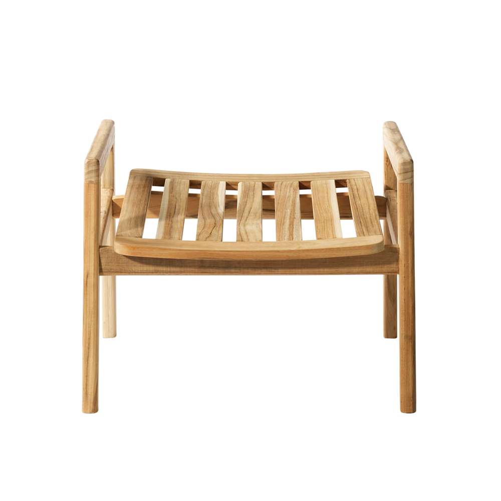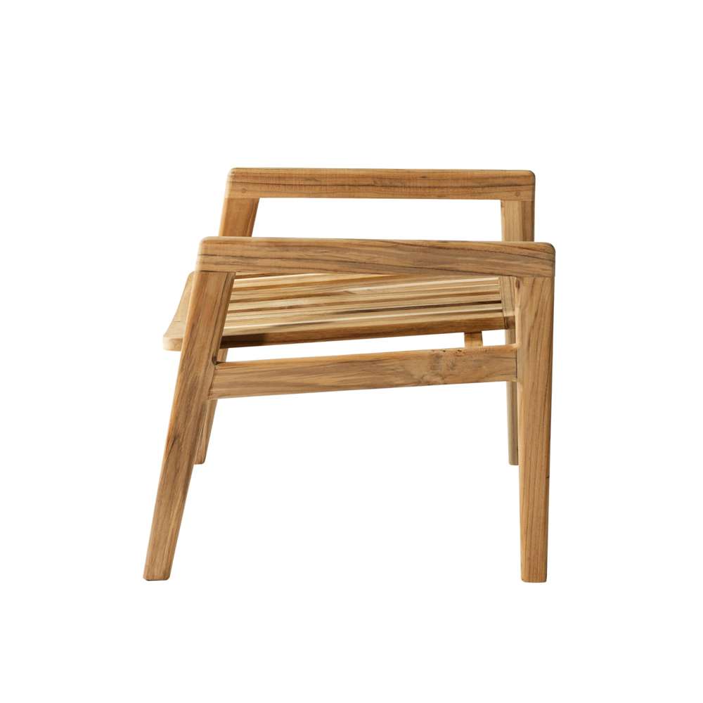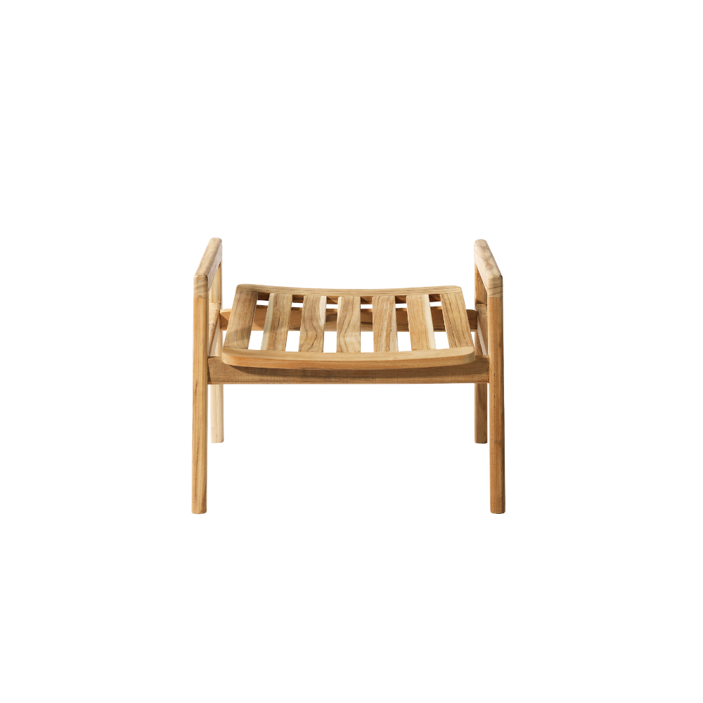 Fodskamlen er fremstillet i massiv teaktræ, som er kendt for sin holdbarhed og naturlige modstandsdygtighed over for vind og vejr. Den olierede overflade fremhæver træets smukke glød og sikrer, at møblet holder sig flot i mange år.