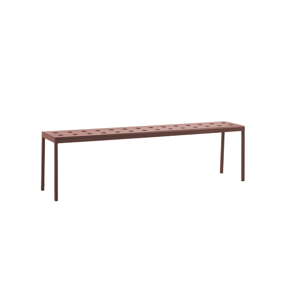 Balcony havebænk L165,5 fra HAY er en rygløs udendørs bænk med et roligt, grafisk udtryk og høj funktionalitet. Designet af Ronan og Erwan Bouroullec, kombinerer bænken det enkle rektangulære design med slanke ben og de karakteristiske perforeringer i sædet, som giver både struktur og karakter.