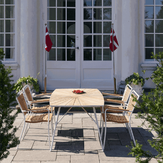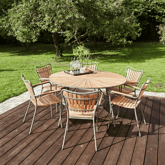 6.999,00 DKKUdsalgspris 6.999,00 DKKDet bådformede Marguerit havebord, med dets unikke design, er et godt alternativ til et rundt bord. Bordpladen er i bæredygtig teaktræ og stellet i rustfrit pulverlakeret aluminium. -