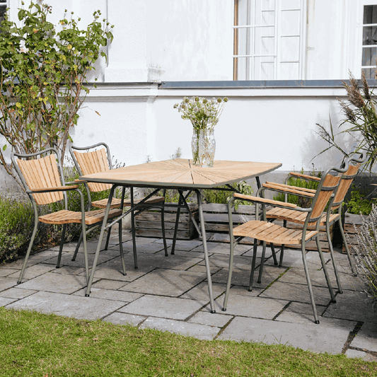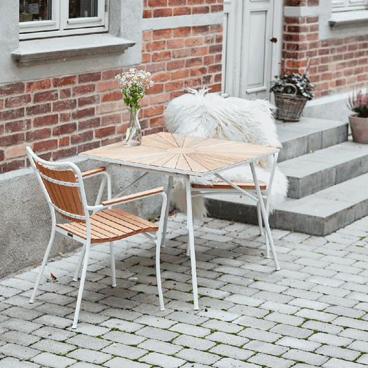 4.999,00 DKKUdsalgspris 4.999,00 DKKMarguerit havebordet er perfekt til terrassen med dets unikke design. Bordpladen er i bæredygtig teaktræ og stellet i rustfrit pulverlakeret aluminium. -
