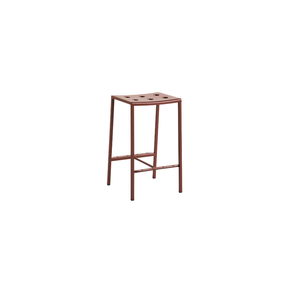 HAYs Balcony barstol i lav højde er en elegant løsning til uderum, hvor der er brug for både stil og funktionalitet. Designet kombinerer en enkel, rektangulær form med et let skålformet sæde og perforeringer, der ikke blot skaber et grafisk udtryk, men også øger stolens styrke.