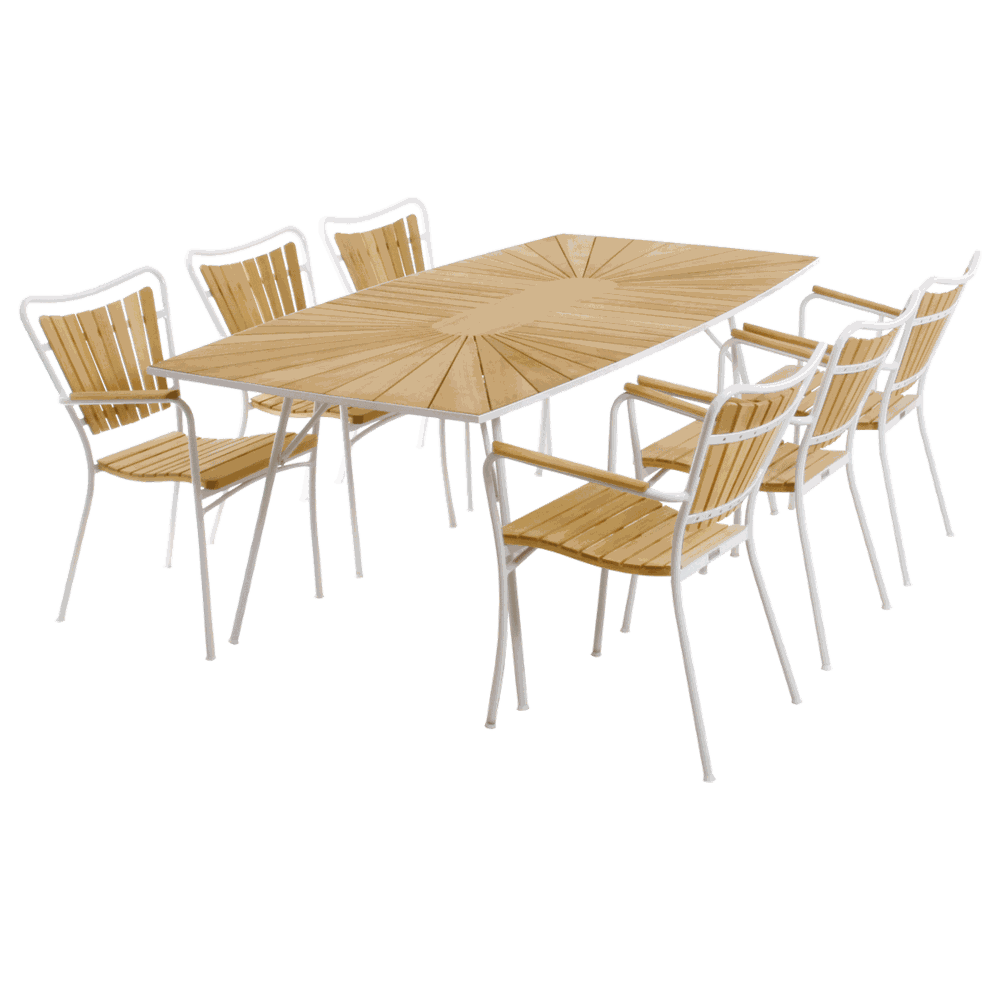 Stort Marguerit havesæt bestående af Marguerit bådformet havebord L200 samt 6 Marguerit havestole. Bordet passer perfekt til den store familie og har plads til op til 8 personer. Bordet kan foldes sammen og dermed nemt stilles væk til efteråret, og havestolene kan ligeledes stables, så de ikke fylder særlig meget.