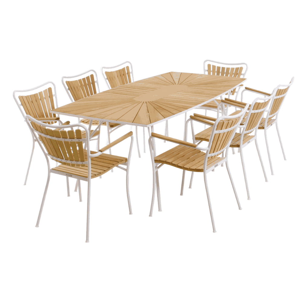 Stort Marguerit havesæt bestående af Marguerit bådformet havebord L200 samt 8 Marguerit havestole. Bordet passer perfekt til den store familie med plads til op til 8 personer omkring bordet. Bordet kan foldes sammen og dermed nemt stilles væk til efteråret, og havestolene kan ligeledes stables, så de ikke fylder særlig meget.