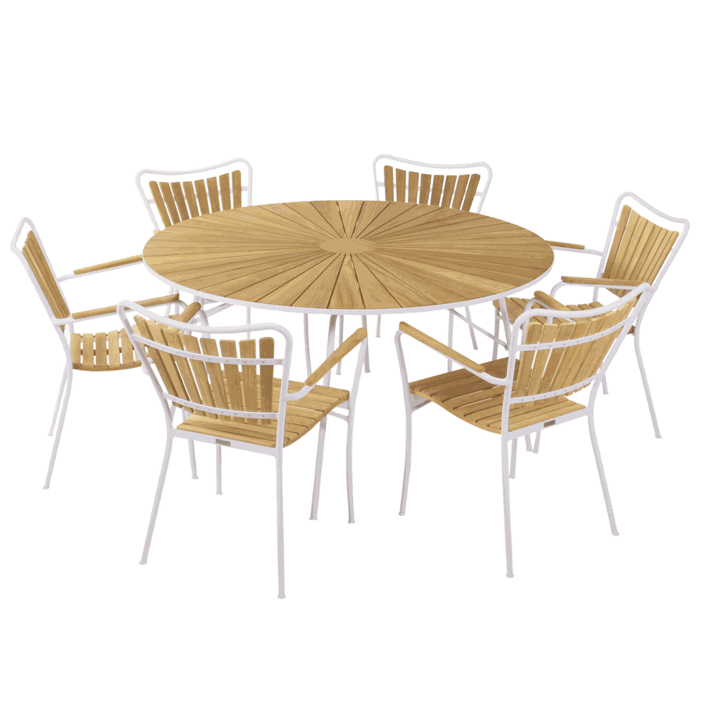 Dette smukke Marguerit havesæt består af 1 x Marguerit havebord Ø140 i hvid samt 6 x Marguerit havestole i hvid. Havebordet måler Ø140 cm og har bordplade i teak og stel i pulverlakeret aluminium. Marguerit havestolene har ergonomisk sæde og ryg, og stel i pulverlakeret aluminium. Sæde, ryg og armlæn er i højkvalitetsteak.