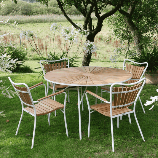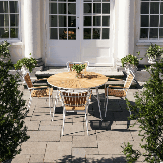 14.995,00 DKKUdsalgspris 14.995,00 DKKDette smukke Marguerit havesæt består af 1 x Marguerit havebord Ø120 i hvid samt 4 x Marguerit havestole i hvid. Havebordet måler Ø120 cm og har bordplade i teak og... -