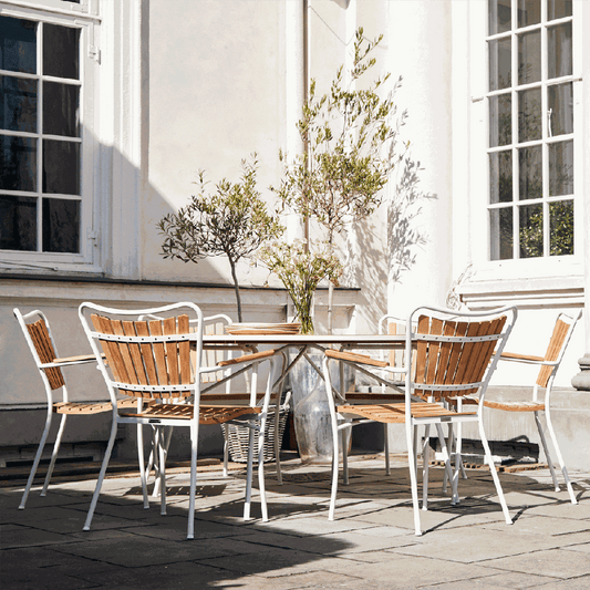 20.993,00 DKKUdsalgspris 20.993,00 DKKDette smukke Marguerit havesæt består af 1 x Marguerit havebord Ø140 i hvid samt 6 x Marguerit havestole i hvid. Havebordet måler Ø140 cm og har bordplade i teak og... -