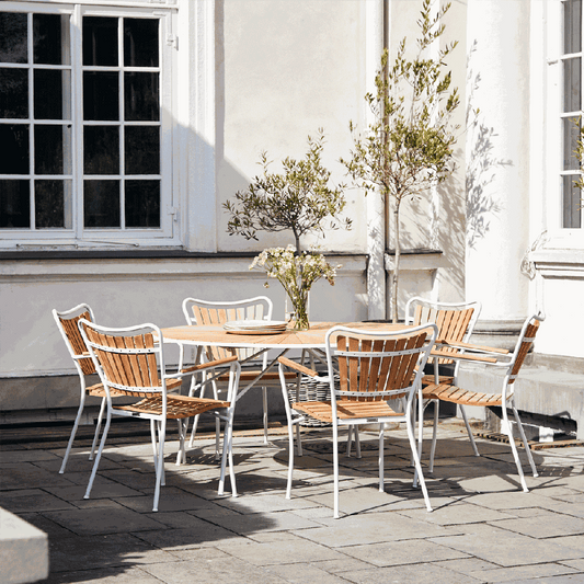 5.899,00 DKKUdsalgspris 5.899,00 DKKDet runde Marguerit havebord er perfekt til sammenkomster og skaber en elegance på terrassen med dets unikke design. Bordpladen er i massiv bæredygtig teaktræ og stellet i rustfrit pulverlakeret aluminium.... -