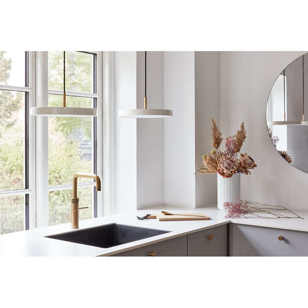 Umage Asteria Mini Pearl White Ø 31 x 10,5 cm pendel er en stilren lampe, der kombinerer skandinavisk minimalisme med moderne funktionalitet. Den elegante perlehvide farve tilfører et lyst og harmonisk udtryk, som passer perfekt over spisebordet, i køkkenet eller på kontoret.