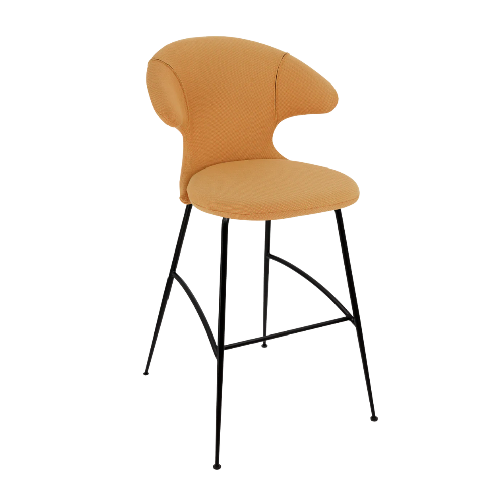 Med sit sorte stålstel og bløde polstring i genanvendt polyester er denne Time Flies barstol fra Umage skabt til at give hjemmet et moderne og afbalanceret udtryk. Designet er let og svungent, med god støtte i både ryg og armlæn – og en komfortabel siddehøjde på 75 cm, perfekt til køkkenøen eller den høje bardisk.