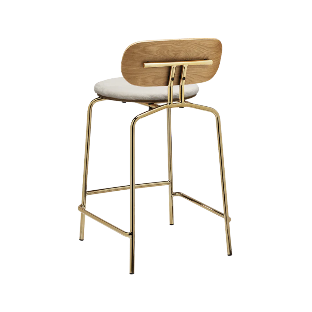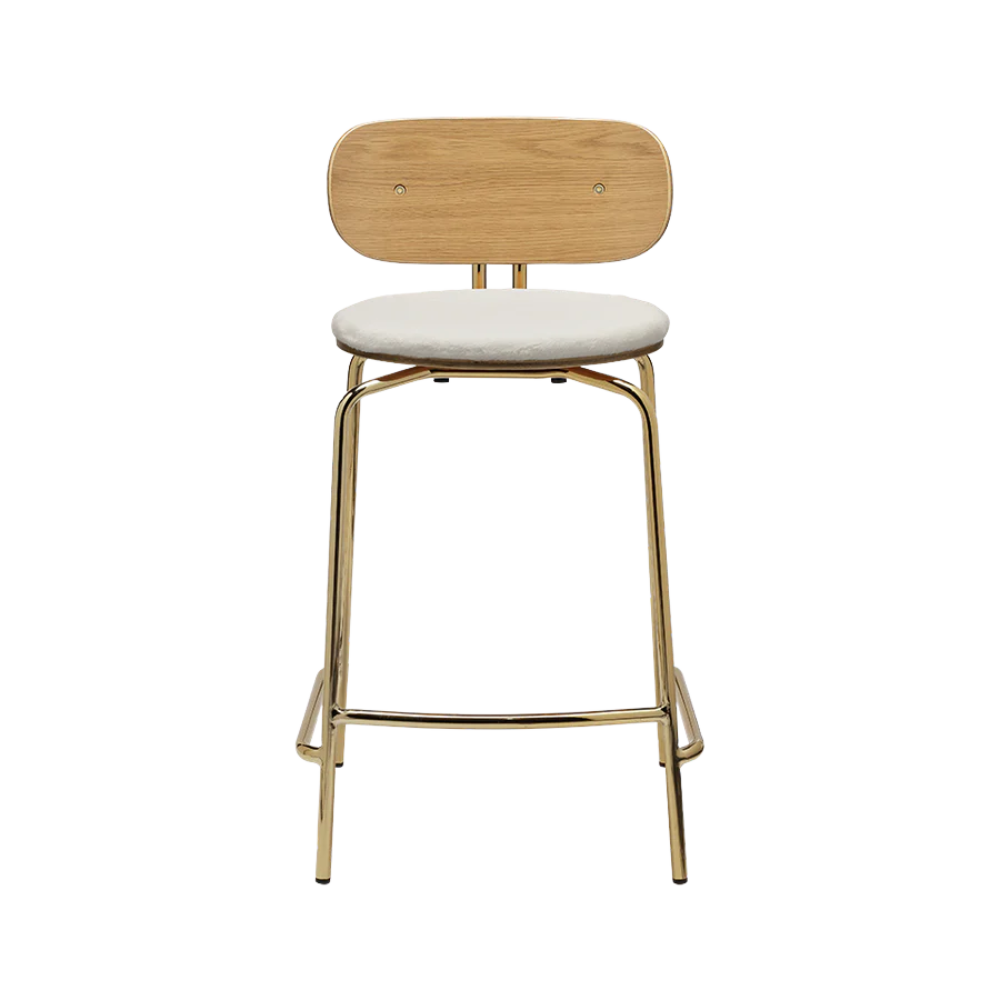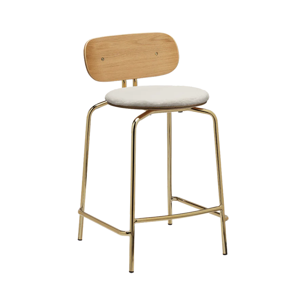 Curious Counterstolen fra Umage kombinerer klassisk skandinavisk formsprog med varme og taktile materialer. Det slanke stel i messing løfter sædet i egefiner med Teddy-betræk og skaber en let og indbydende helhed.