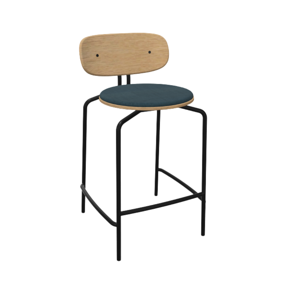 Curious Counterstolen fra Umage forener moderne minimalisme med bæredygtige materialer. Den let buede skal i egefiner hviler på et sort stålstel, mens sædet er beklædt med genanvendt polyester – både slidstærkt og behageligt.
