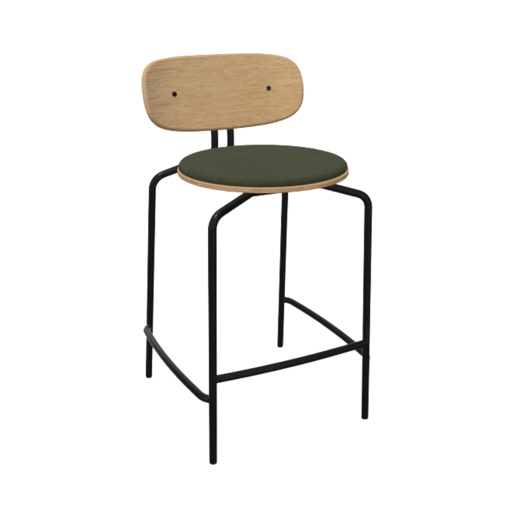 Curious Counterstolen fra Umage forener moderne minimalisme med bæredygtige materialer. Den let buede skal i egefiner hviler på et sort stålstel, mens sædet er beklædt med genanvendt polyester – både slidstærkt og behageligt.
