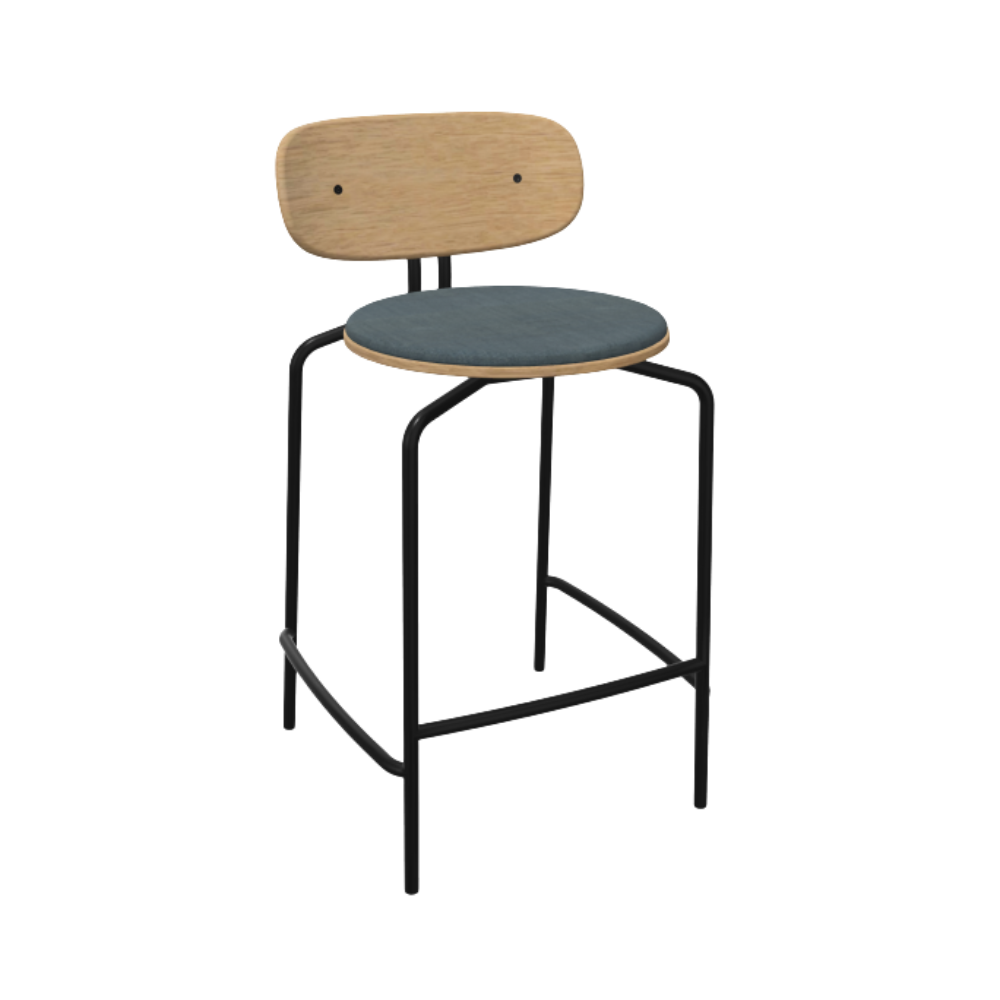 Curious Counterstolen fra Umage forener moderne minimalisme med bæredygtige materialer. Den let buede skal i egefiner hviler på et sort stålstel, mens sædet er beklædt med genanvendt polyester – både slidstærkt og behageligt.